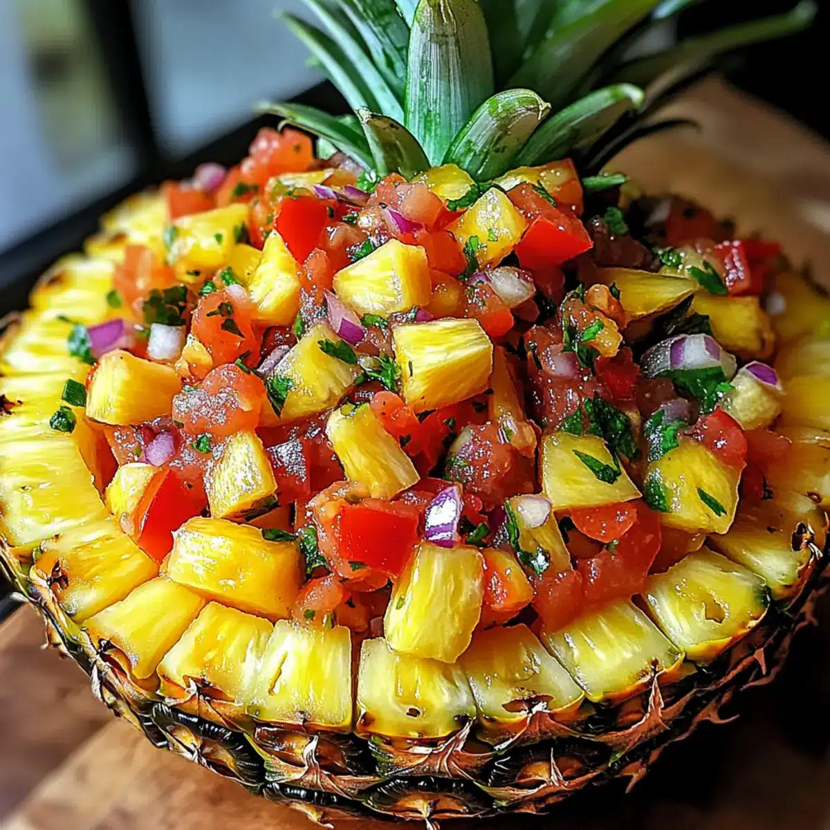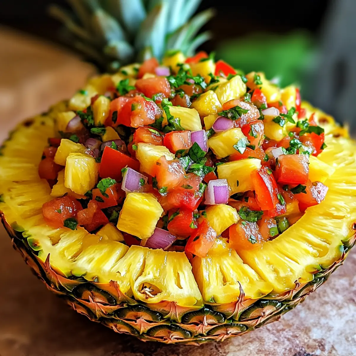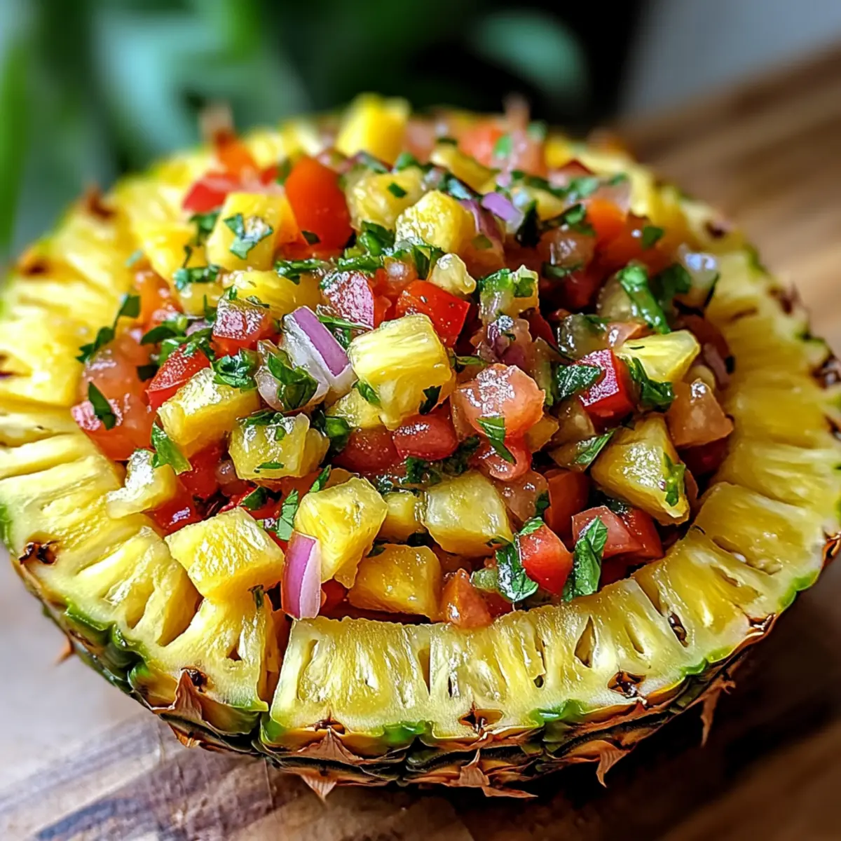- Fülle die frische Ananassalsa in die ausgehöhlte Ananasschale.
