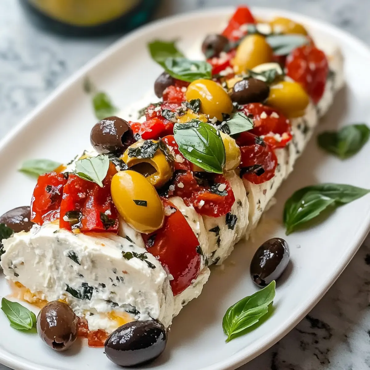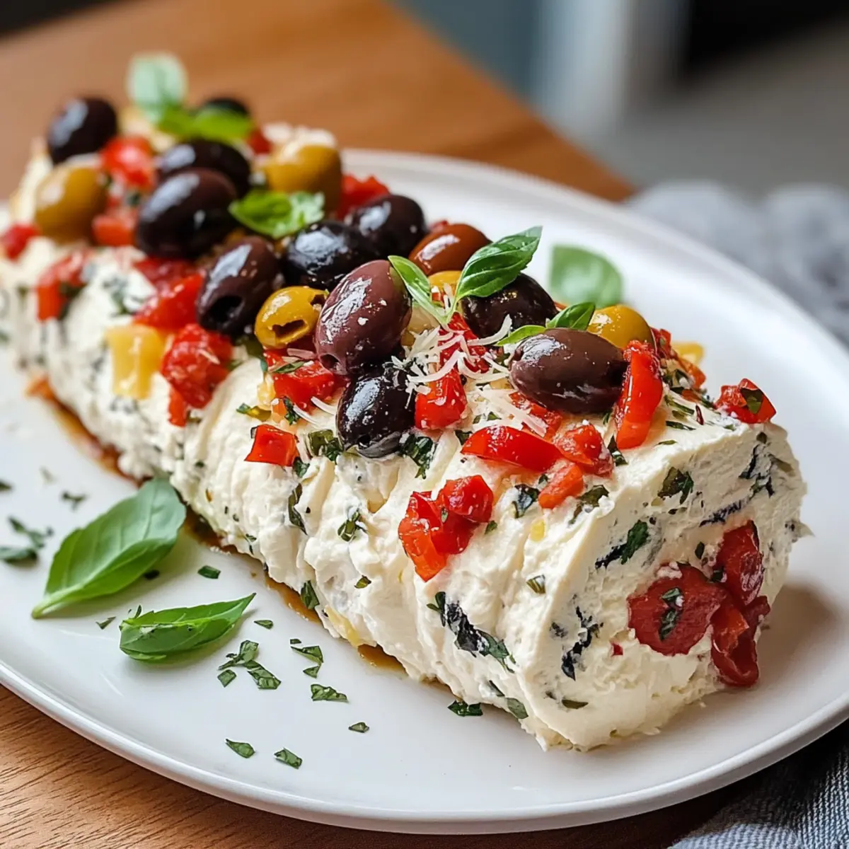 Nimm die Log aus dem Kühlschrank und entferne die Frischhaltefolie vorsichtig. Platziere den Antipasto Frischkäse auf einem Platzteller und beträufele ihn mit 2 Esslöffeln hochwertigem, extra-nativem Olivenöl. Garniere das Ganze mit zusätzlichen frischen Basilikumblättern und serviere es zusammen mit einer Auswahl an Crackern oder frischem Baguette für einen unwiderstehlichen Snack.