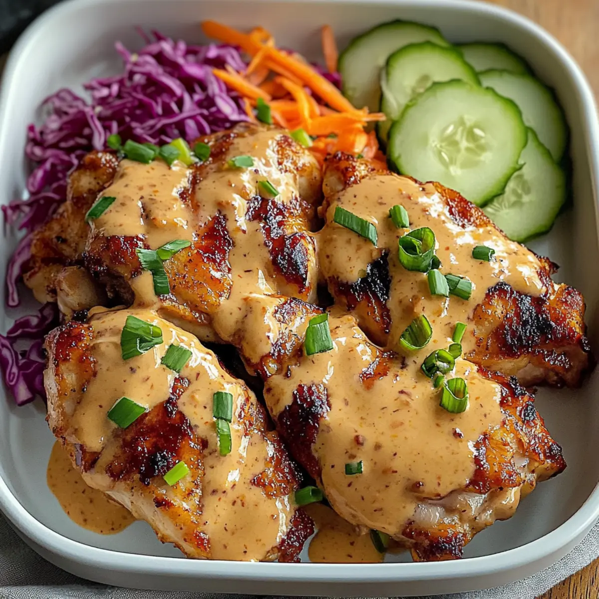 Richte das Bang Bang Hähnchen zusammen mit gedämpftem Reis, geriebenem Rotkohl, geriebenen Karotten und Gurkenscheiben an. Verteile die restliche Bang Bang Sauce großzügig über das Hähnchen, um den vollen Geschmack zu entfalten. Garnieren mit frischen Frühlingszwiebeln für einen zusätzlichen Farbtupfer.