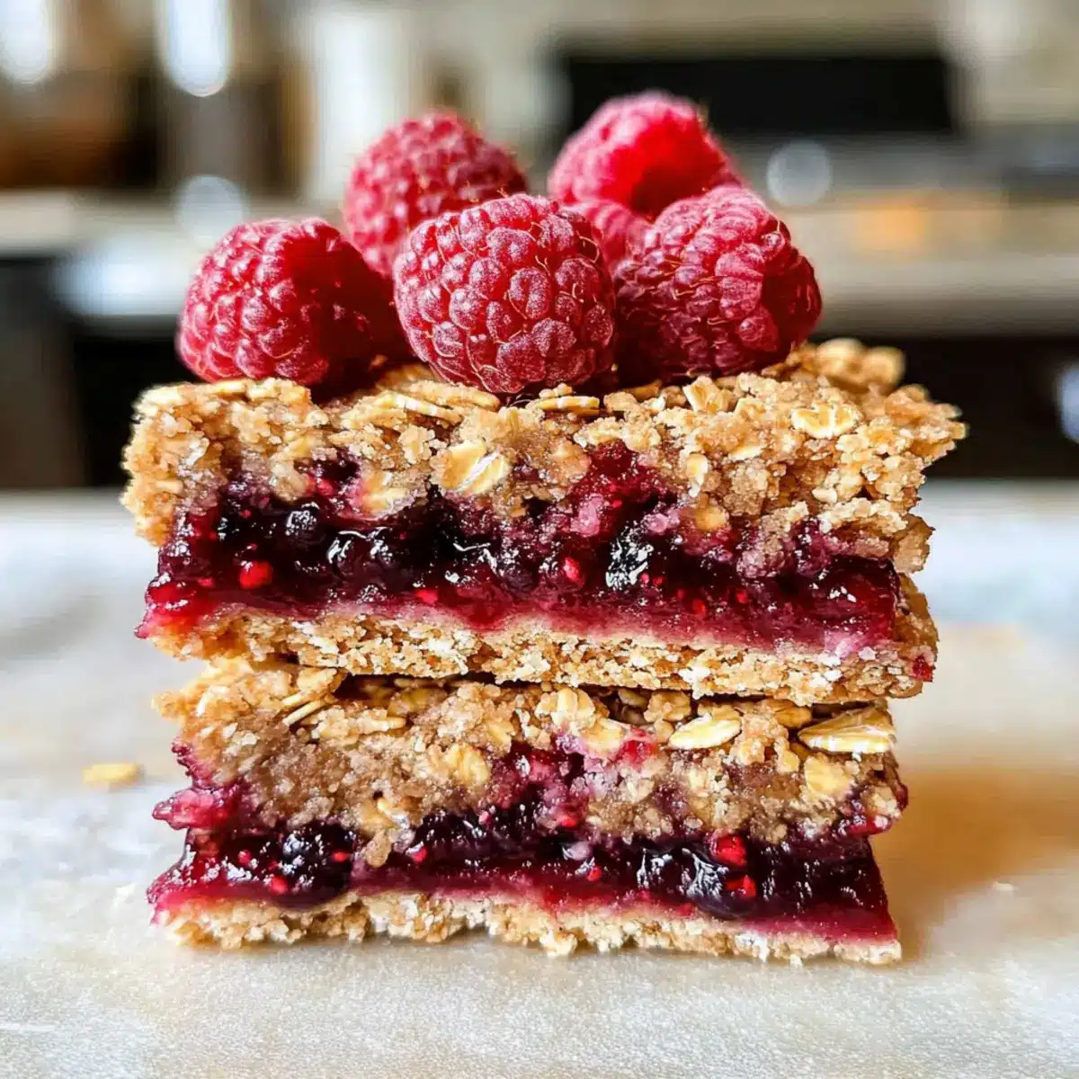 - Krümle die restliche Mischung gleichmäßig über den Himbeeraufstrich und drücke sie leicht an.