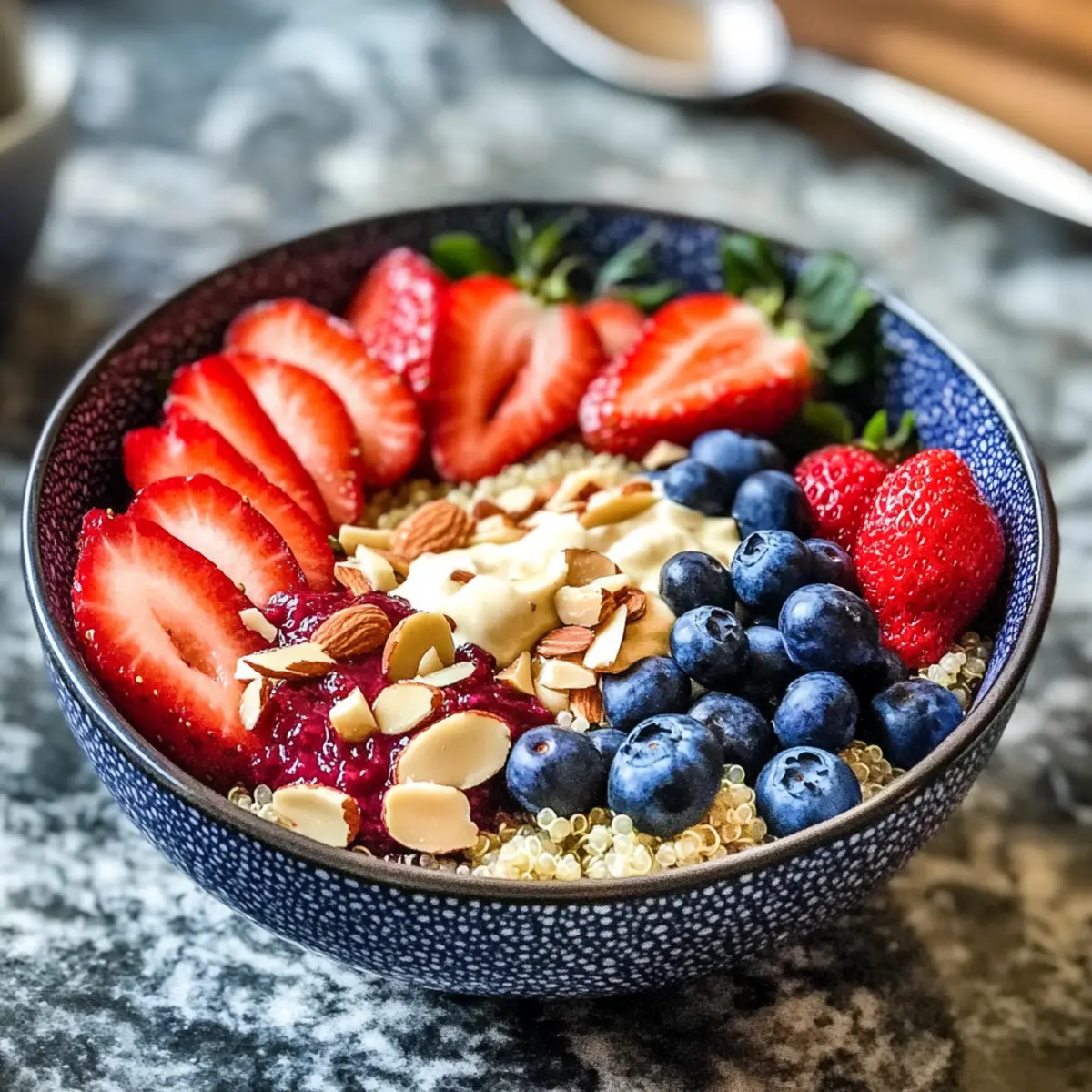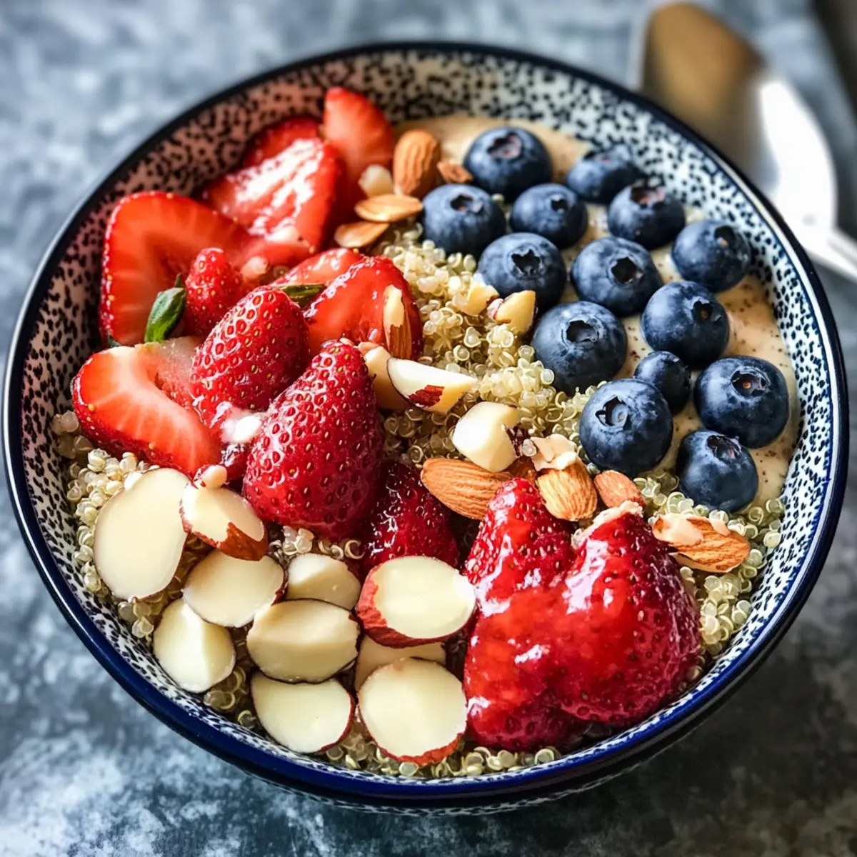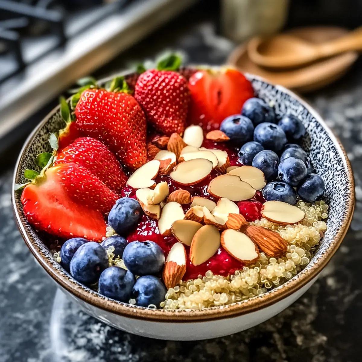 - Toppe deine Beeren-Quinoa Frühstücksbowl mit zusätzlichen Erdbeerscheiben, Blaubeeren und Mandeln.