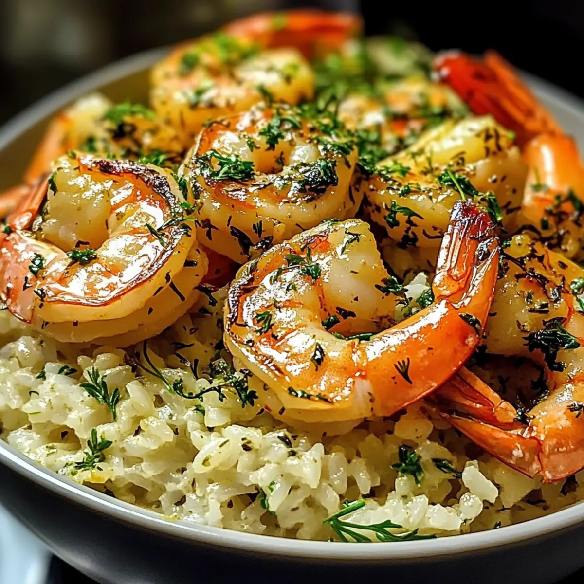 Cremiger Kräuterreis mit Knoblauchbutter-Garnelenbowl