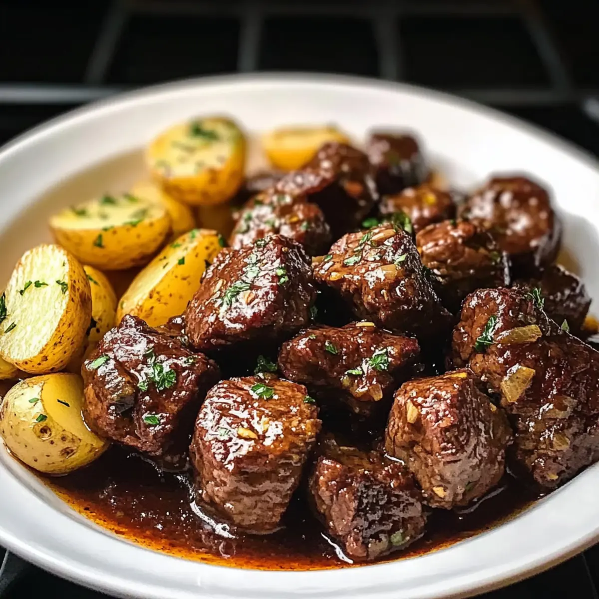 Langsame Kochgarlic Butter Rinderbissen mit Kartoffeln geniessen