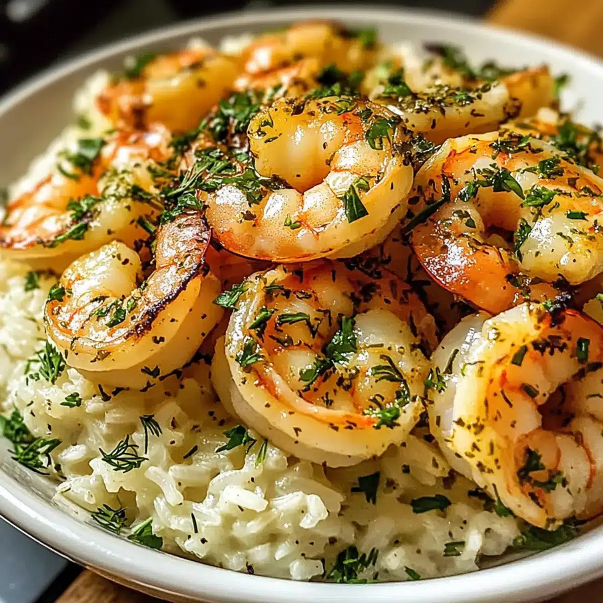Verteilen Sie den lockeren, cremigen Kräuterreis gleichmäßig auf Schalen. Löffeln Sie die warme Sauce über den Reis und garnieren Sie das Ganze mit den gebratenen Garnelen. Fügen Sie nach Belieben zusätzliche frische Kräuter hinzu und servieren Sie die Cremige Kräuterreis mit Knoblauchbutter-Garnelenbowl sofort heiß für ein köstliches Erlebnis.