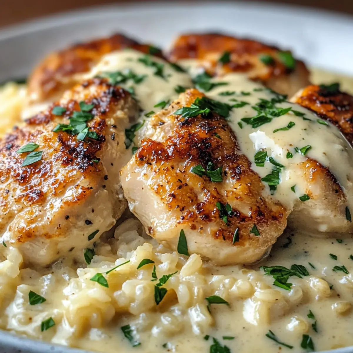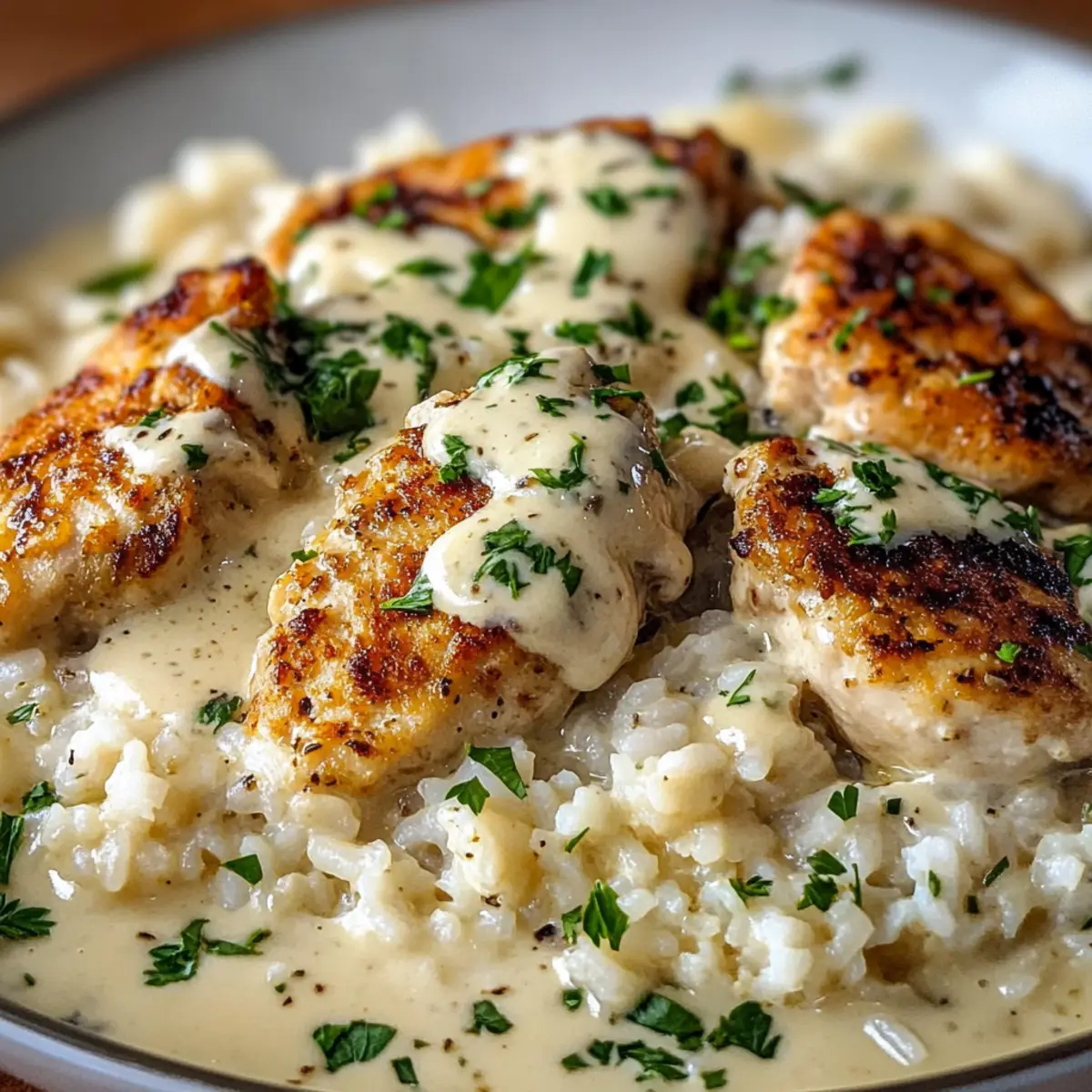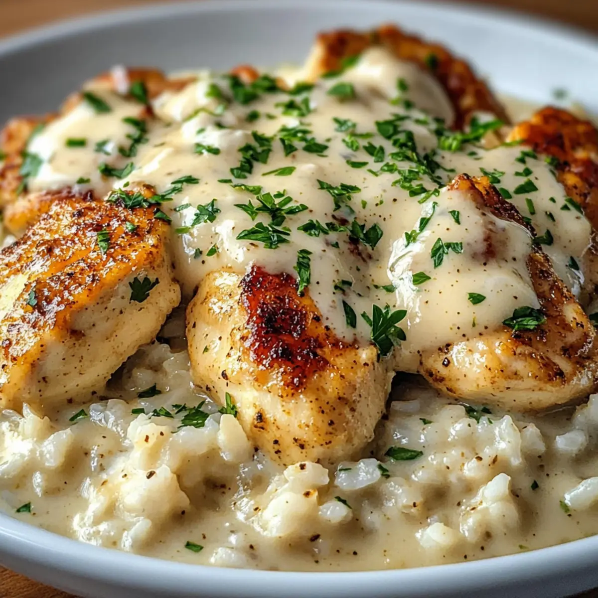 - Schritt 6: Anrichten und servieren: Nach dem Garen das cremige Hähnchen und Reis auf Tellern anrichten. Mit frisch gehackter Petersilie garnieren und servieren.