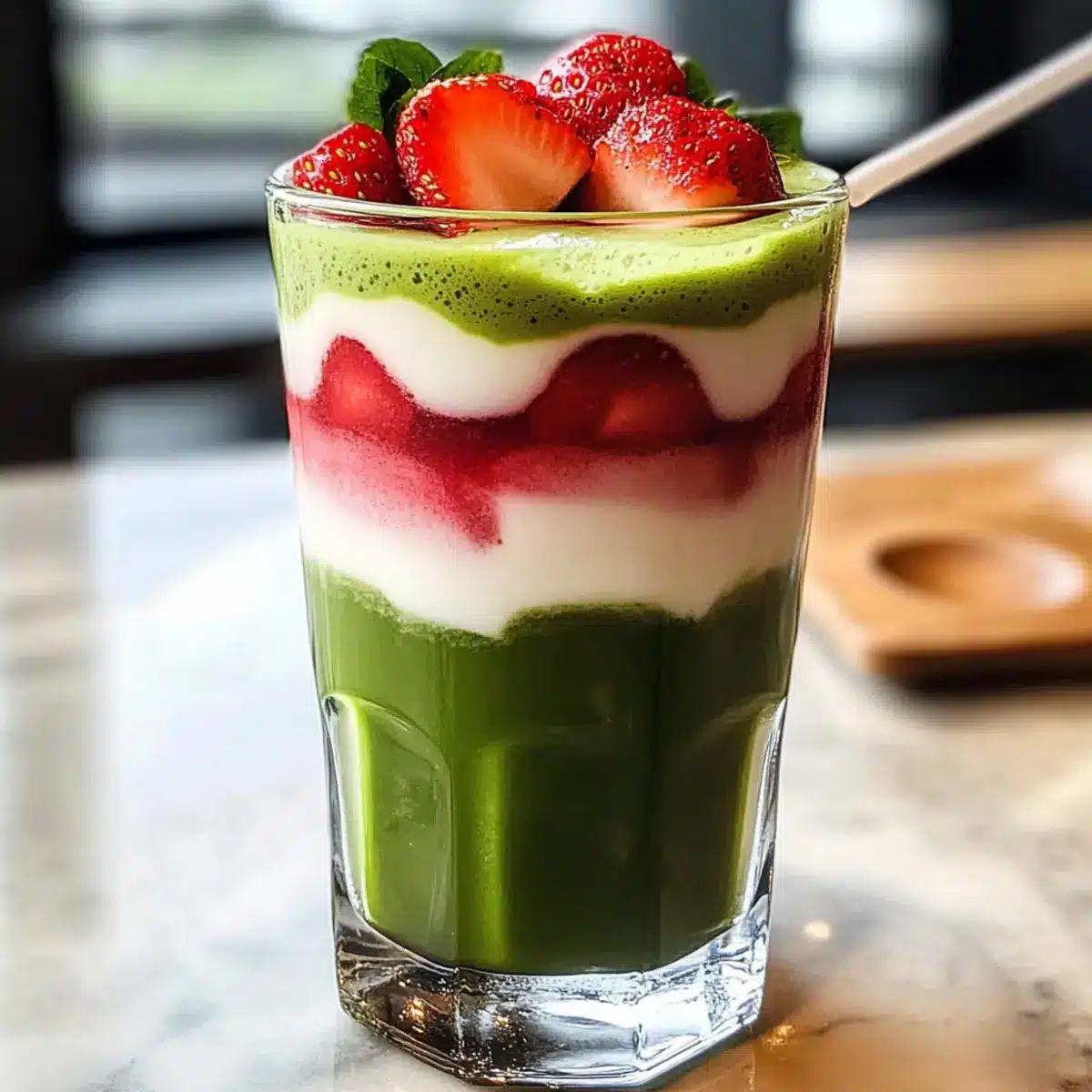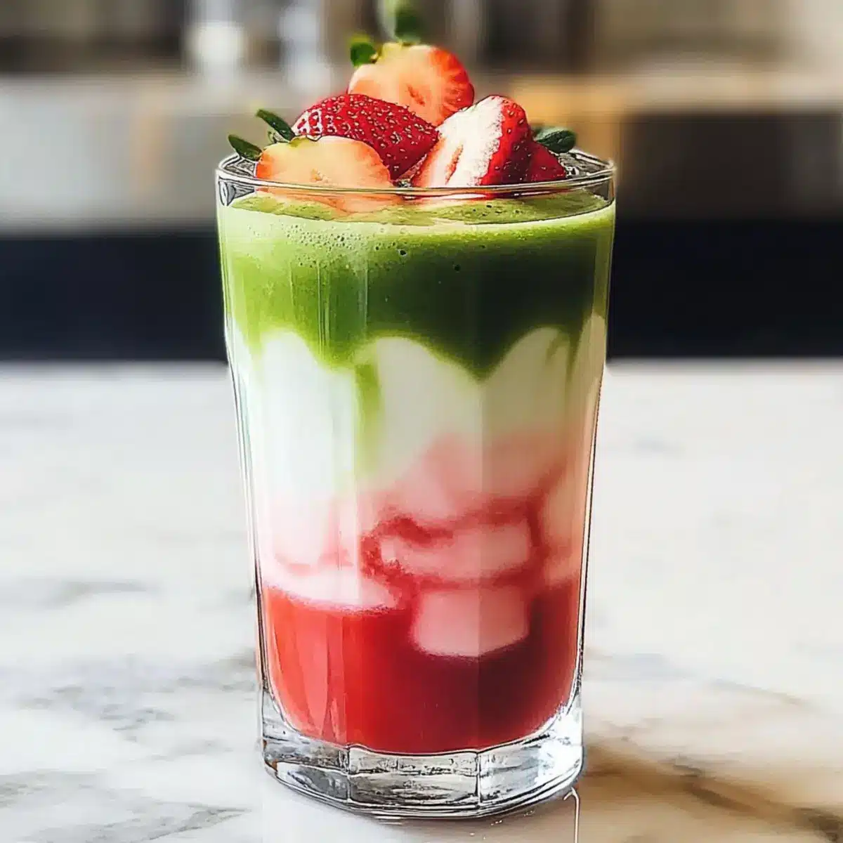 - Serviere die eisige Erdbeer-Matcha-Latte sofort!