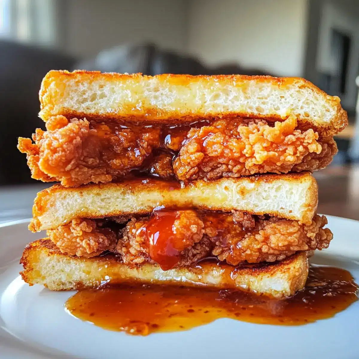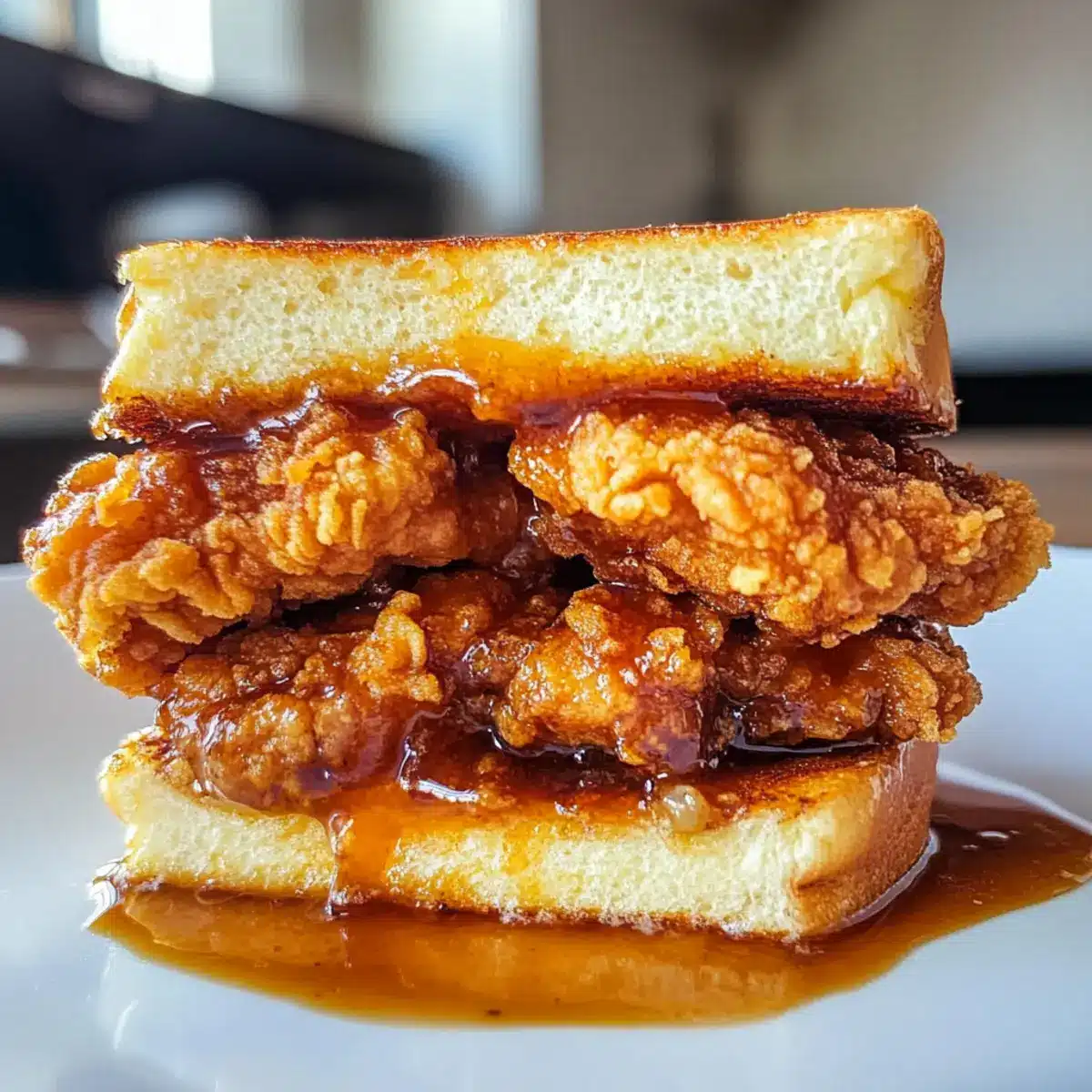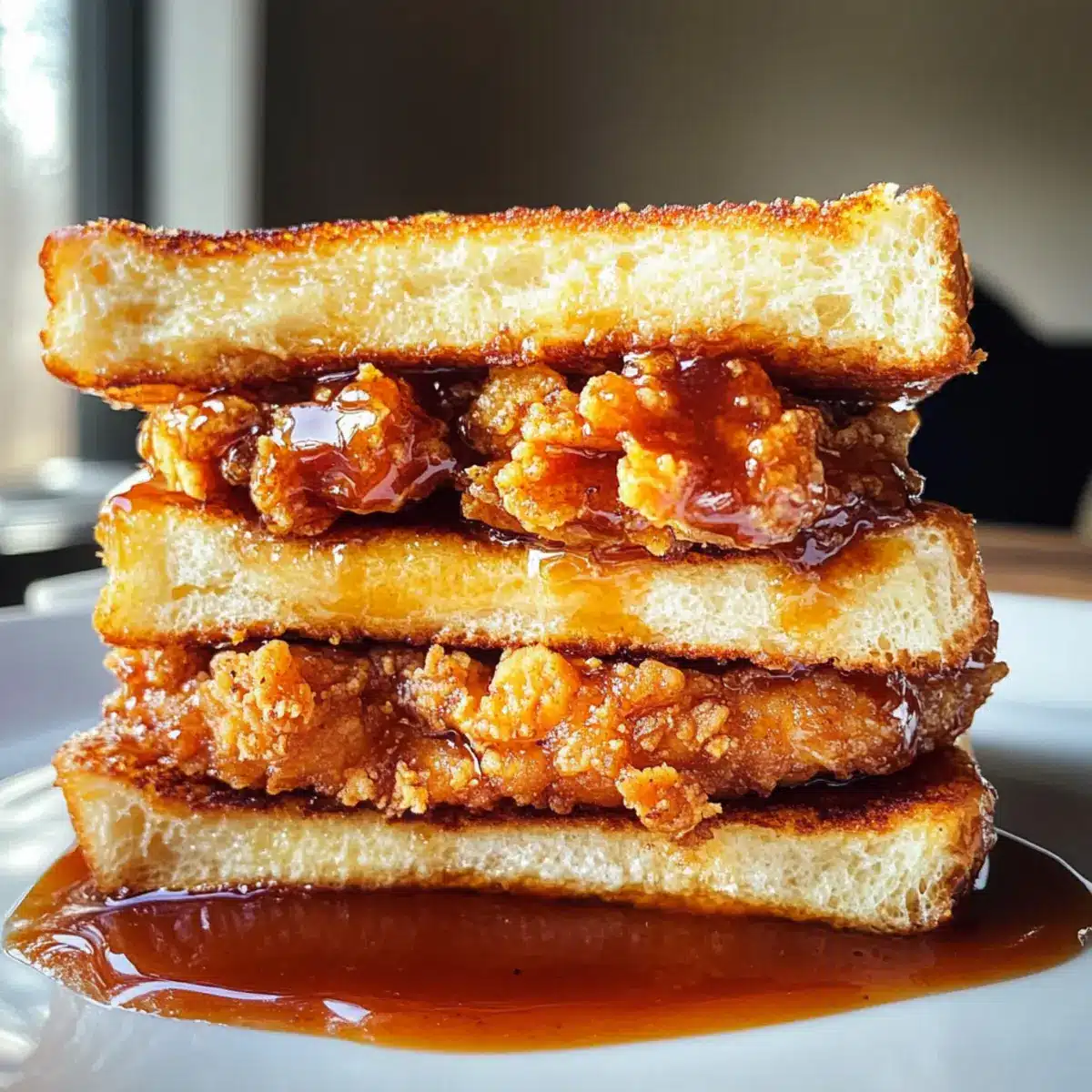 - Sandwich zusammenbauen: Lege ein Stück French Toast auf einen Teller, platziere ein Hähnchenstück darüber und träufle die Sauce drüber.