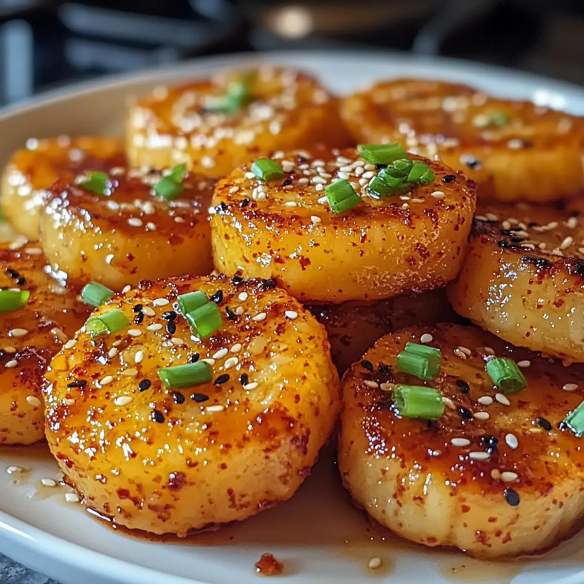 - Richten Sie die gebratenen Reiskuchen auf einem Teller an und garnieren Sie mit Frühlingszwiebeln und gerösteten Sesamsamen.