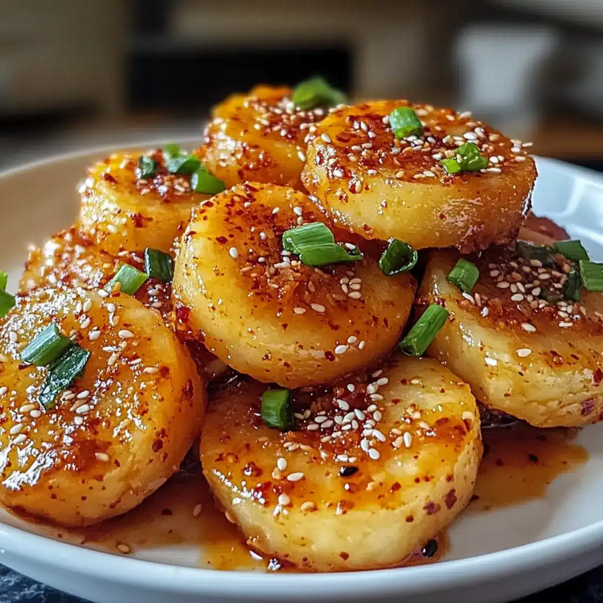 Richten Sie die gebratenen koreanischen Reiskuchen auf einem Teller an und garnieren Sie sie mit fein gehackten Frühlingszwiebeln und gerösteten Sesamsamen. Diese letzten Zutaten verleihen dem Gericht nicht nur Farbe, sondern auch eine extra Portion Geschmack und Textur.