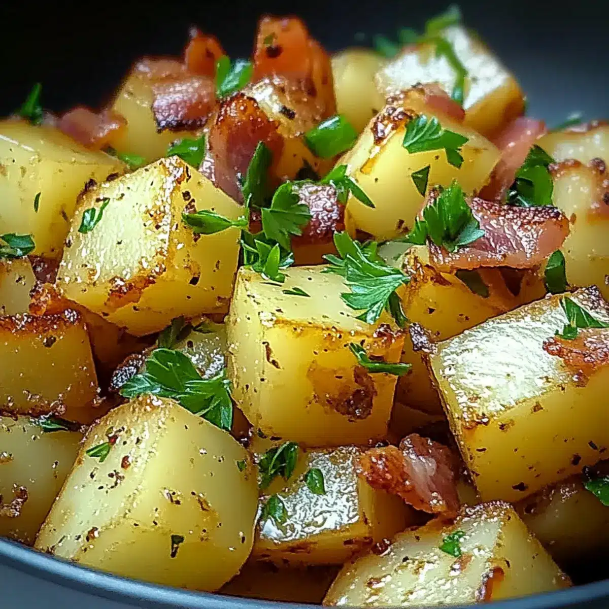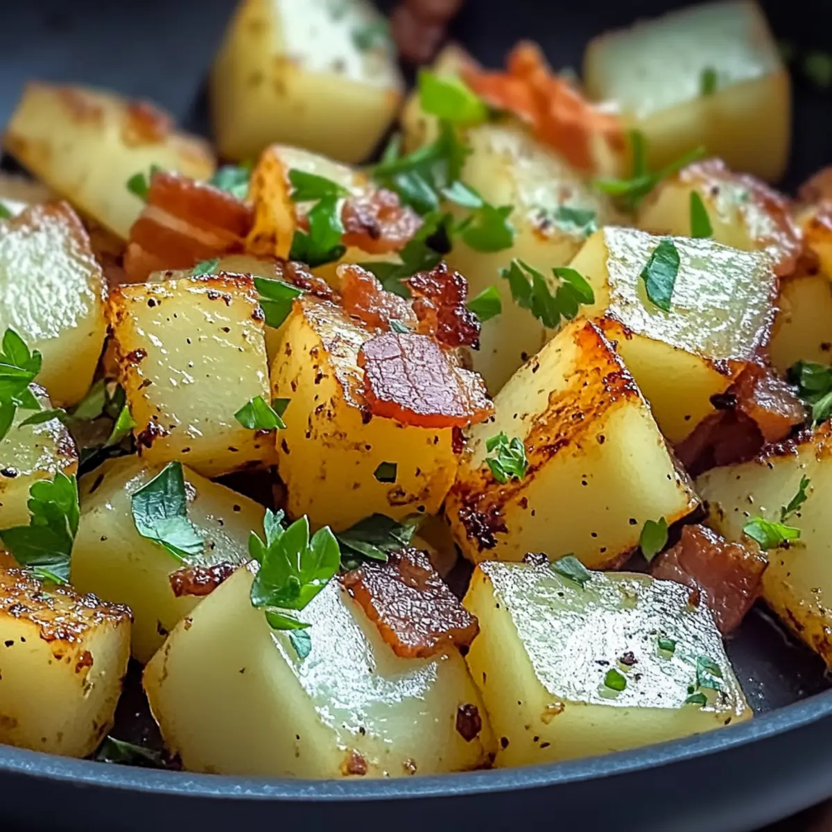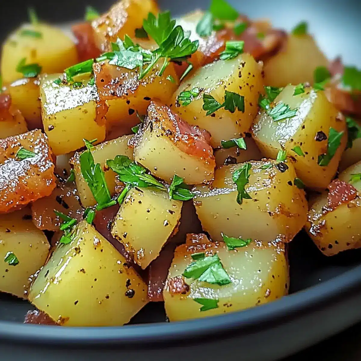 Den knusprigen Bacon zurück in die Pfanne geben und vorsichtig unter das Gemüse mischen. Kurz erwärmen, bis der Bacon wieder heiß ist. Das Gericht auf Teller anrichten und optional mit frisch gehackter Petersilie garnieren, um Farbe und Frische hinzuzufügen. Warm servieren und genießen!