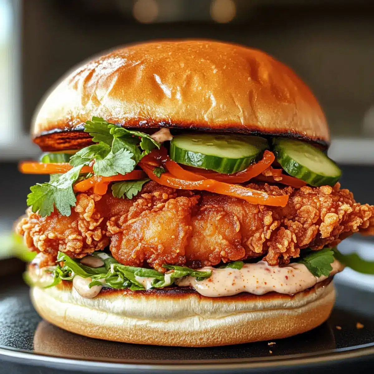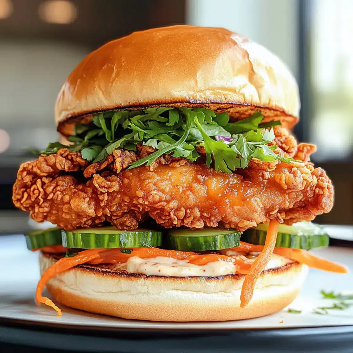 Toastet die Brötchen leicht, bis sie warm und schön goldbraun sind. Bestreicht beide Innenseiten jedes Brötchens mit der Chili-Mayonnaise. Legt das knusprige Hühnchen auf die Unterseite des Brötchens und fügt dann die Gurken, eingelegten Karotten und frischen Kräuter hinzu.
