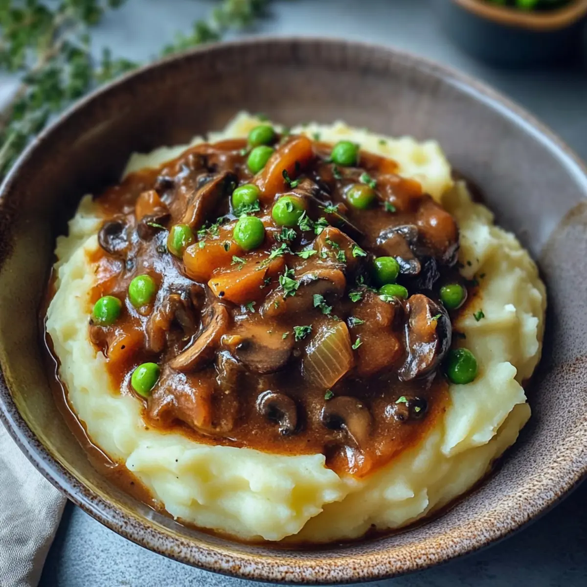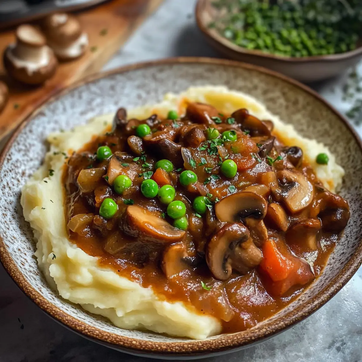 Sobald der Gulasch fertig ist und die Aromen gut durchgezogen sind, serviere ihn über dem cremigen Kartoffelpüree. Der Herzhafter Pilz-Gulasch Bourguignon entfaltet sich auf dem Püree und sorgt für ein wohlschmeckendes, herzhaftes Erlebnis. Вы можете украсить блюдо свежими травами или einem Klecks pflanzlicher Sahne, um es noch ansprechender zu machen.