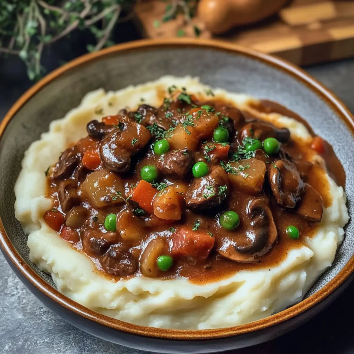 - Sobald der Gulasch fertig ist, serviere ihn über dem cremigen Kartoffelpüree.
