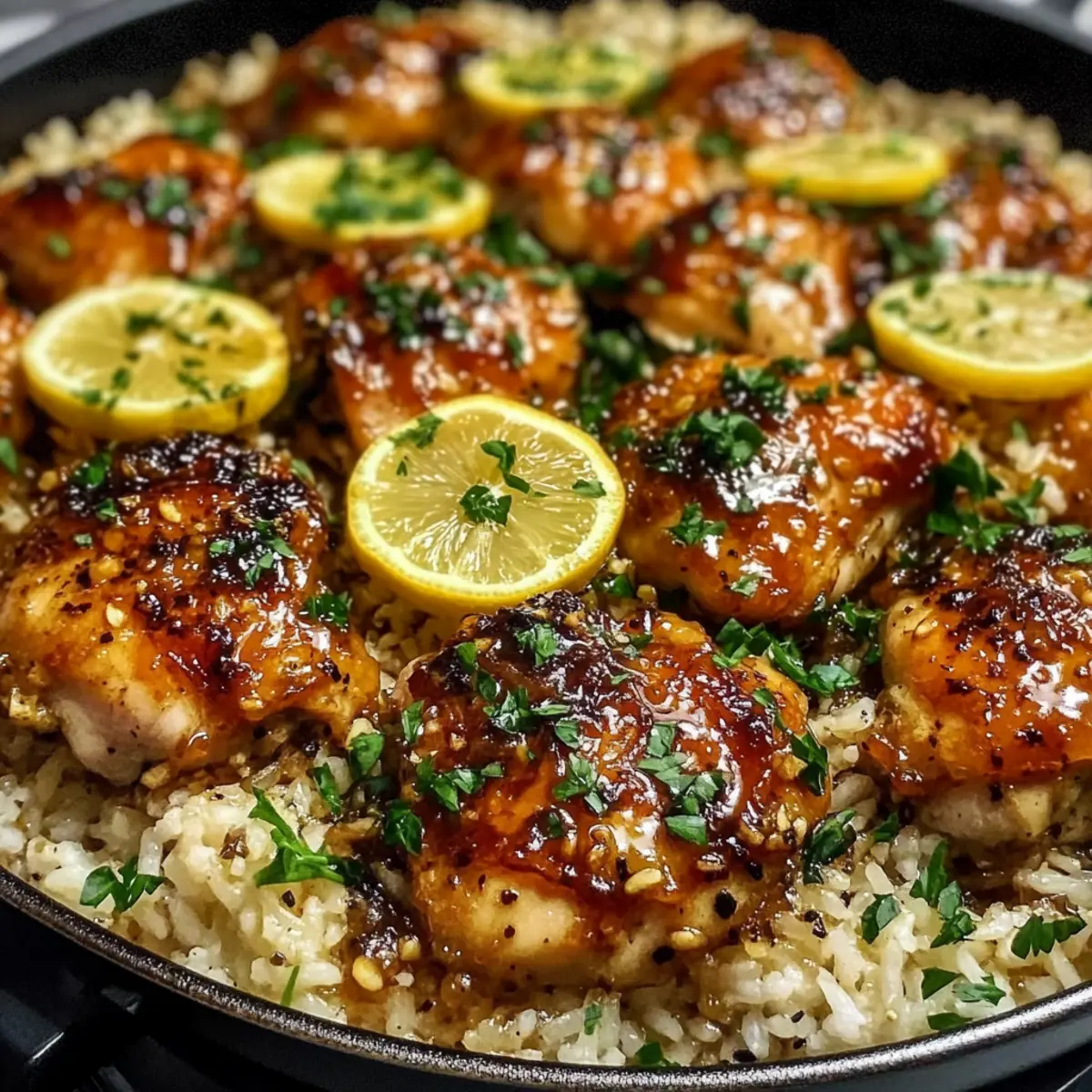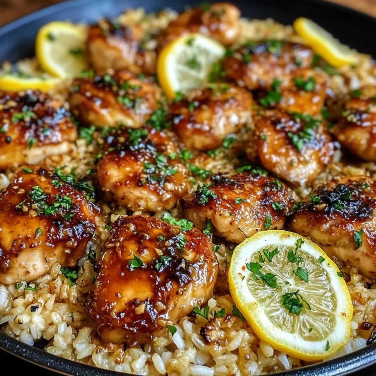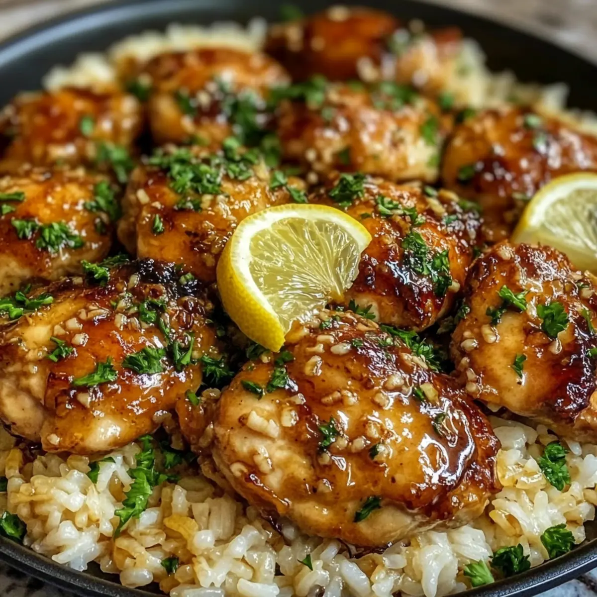 Garnituren für Frische: Frische Petersilie und Zitronenscheiben bringen nicht nur Farbe, sondern auch eine erfrischende Note, die das Honigbutterknoblauchhähnchen und Reis abrundet.