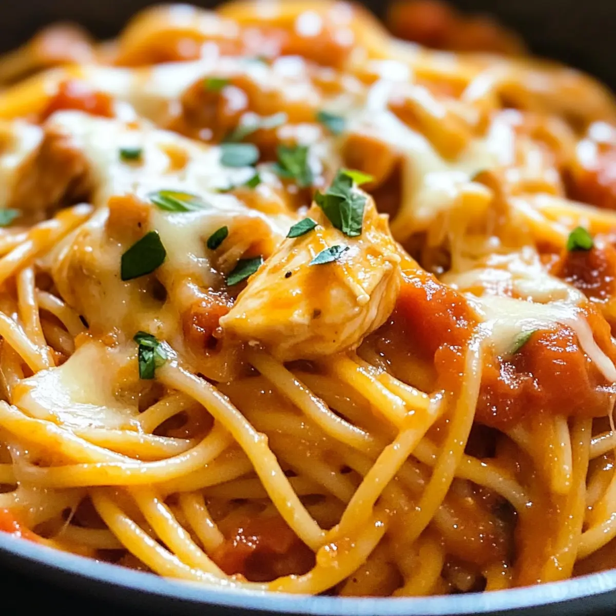 Perfekte Konsistenz: Die Kombination aus zartem Hähnchen und al dente Spaghetti in einer cremigen Soße macht jeden Bissen zu einem Genuss.
