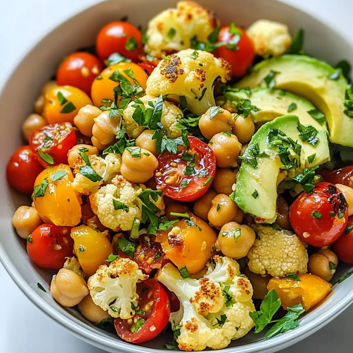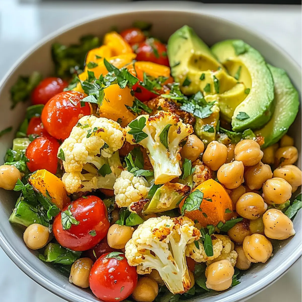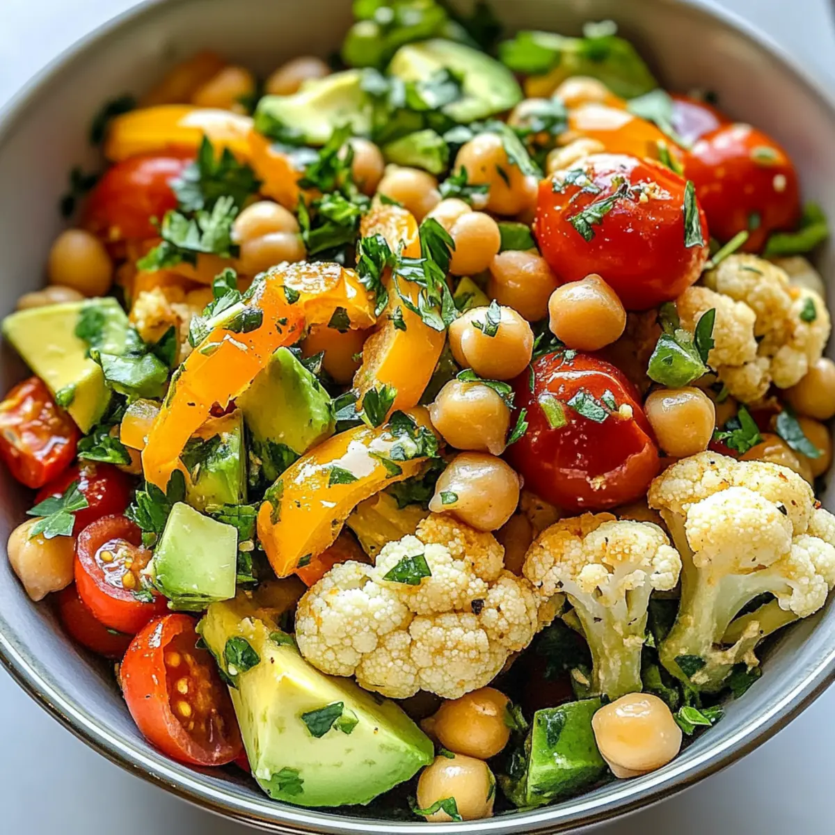 - In einer großen Schüssel kombinieren Sie die Kichererbsen, Paprika, Cherrytomaten, Avocado und gerösteten Blumenkohl.