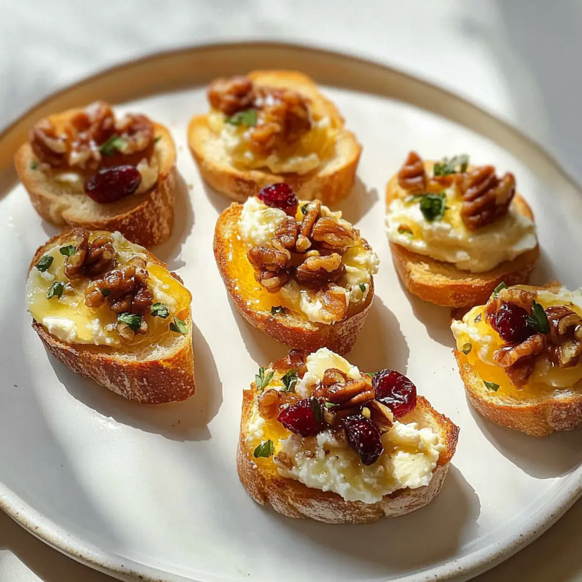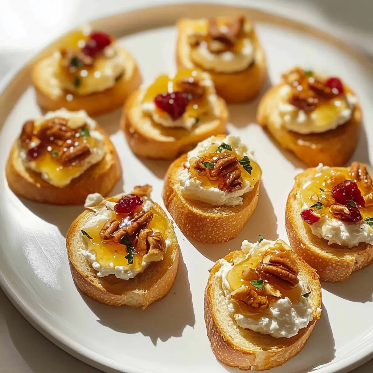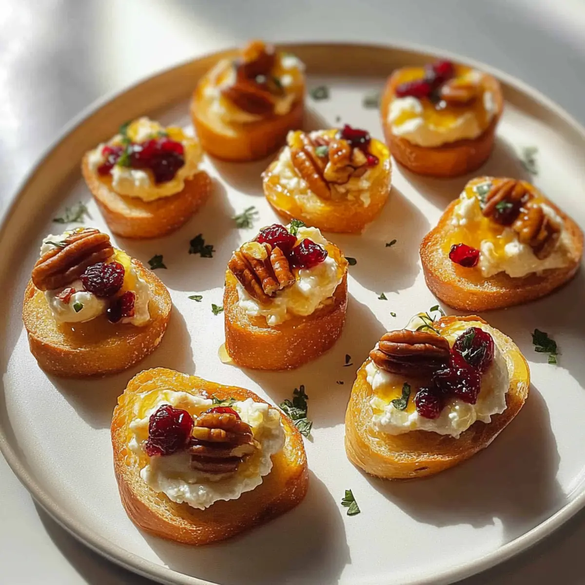 Vollende die kleinen Bissen Vorspeisen, indem du sie mit gehackten kandierten Pecannüssen und getrockneten Cranberries bestreust. Wenn du magst, träufle noch etwas Honig darüber und garniere alles mit frischen Thymianzweigen. Serviere die Vorspeisen sofort, damit die Gäste die frisch zubereiteten Köstlichkeiten genießen können!