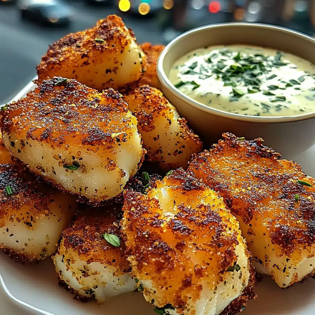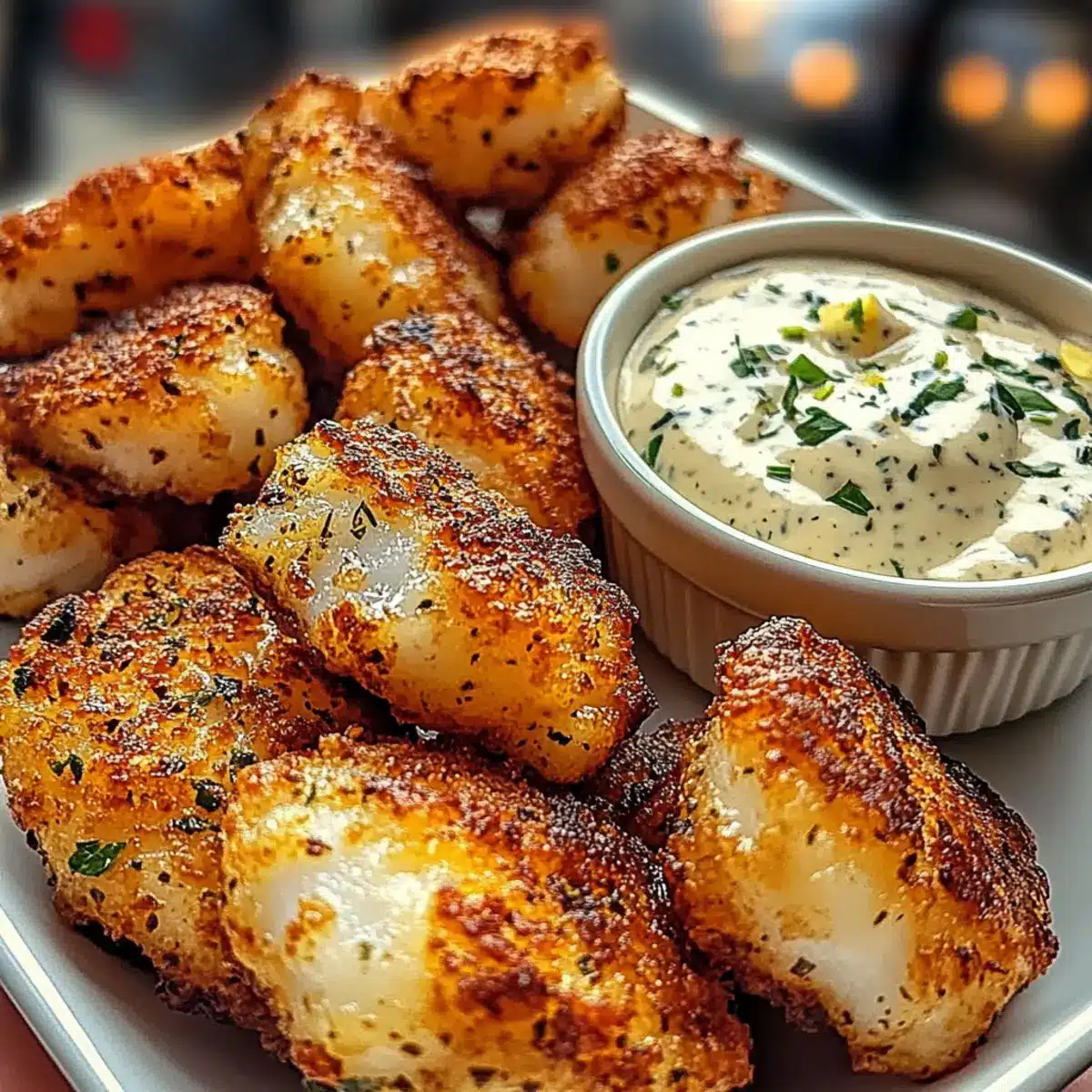 - Serviere die Knoblauchbutter-Kabeljau-Bissen heiß mit dem cremigen Dip an der Seite.