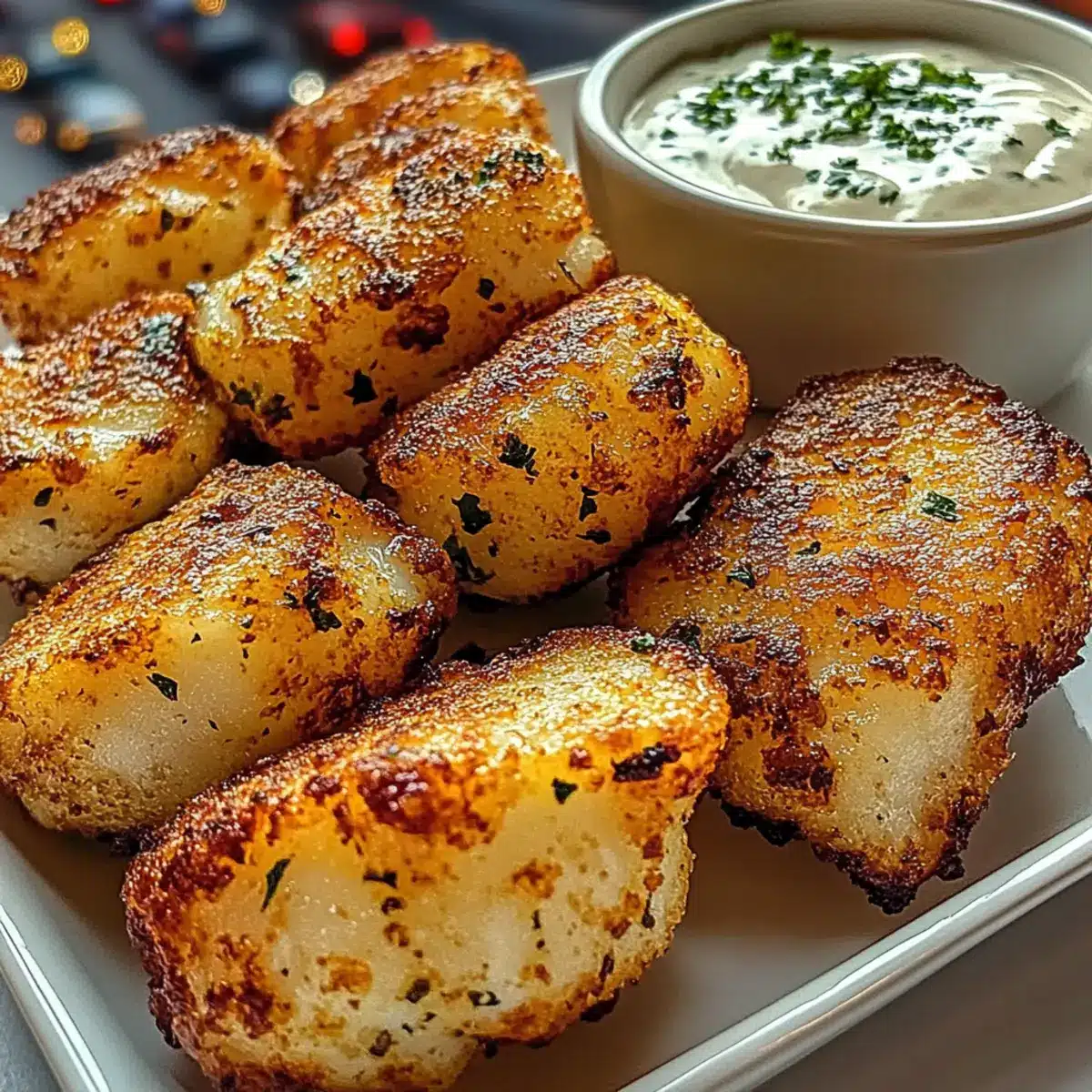 Knoblauchbutter-Kabeljau-Bissen mit cremigem Dip