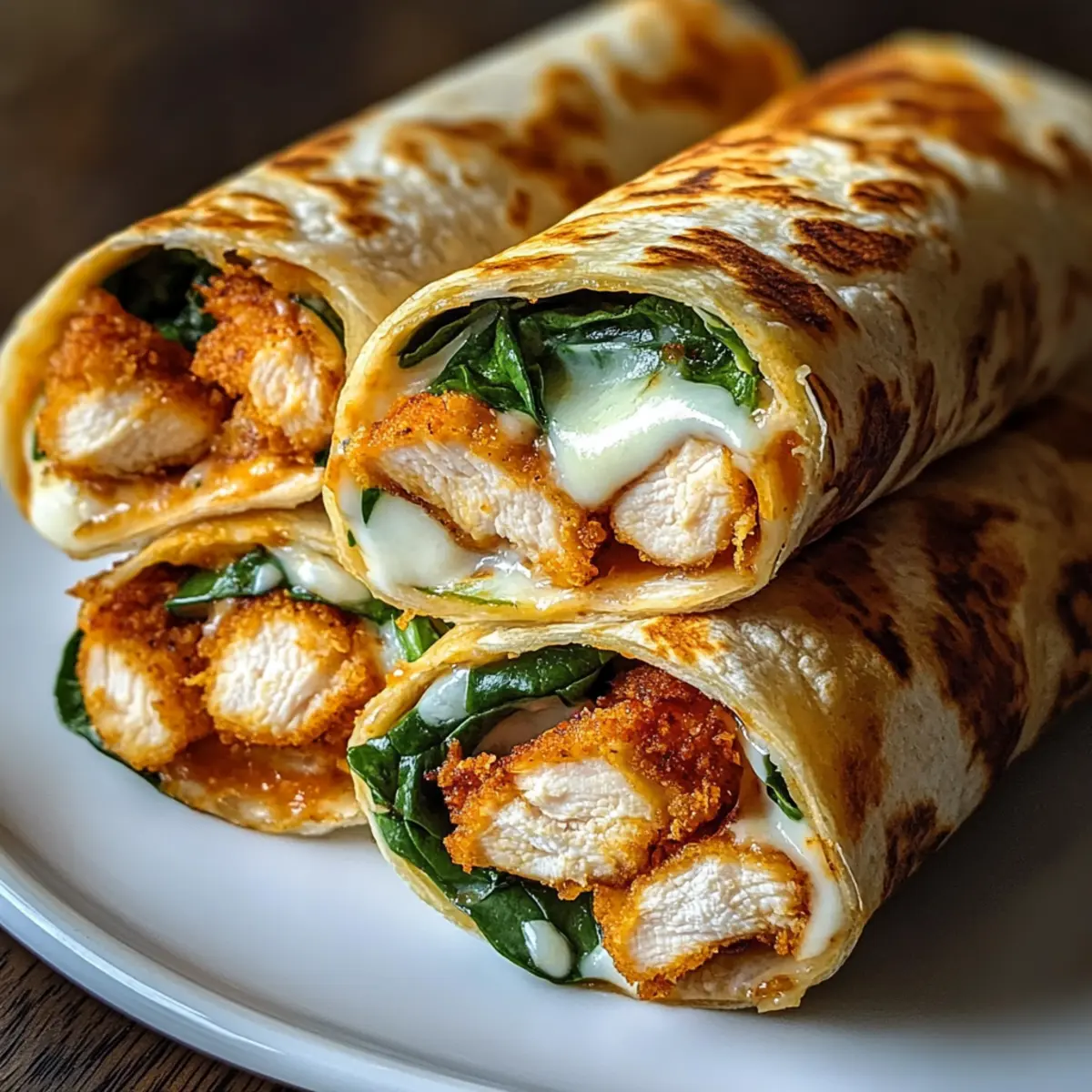 Nimm die Tortillas und lege in die Mitte jeder Tortilla frische Spinatblätter und eine großzügige Menge geriebenen Mozzarella. Füge die knusprigen Hähnchenstreifen hinzu und achte darauf, dass sie gleichmäßig verteilt sind, damit jeder Biss vollmundig ist.
