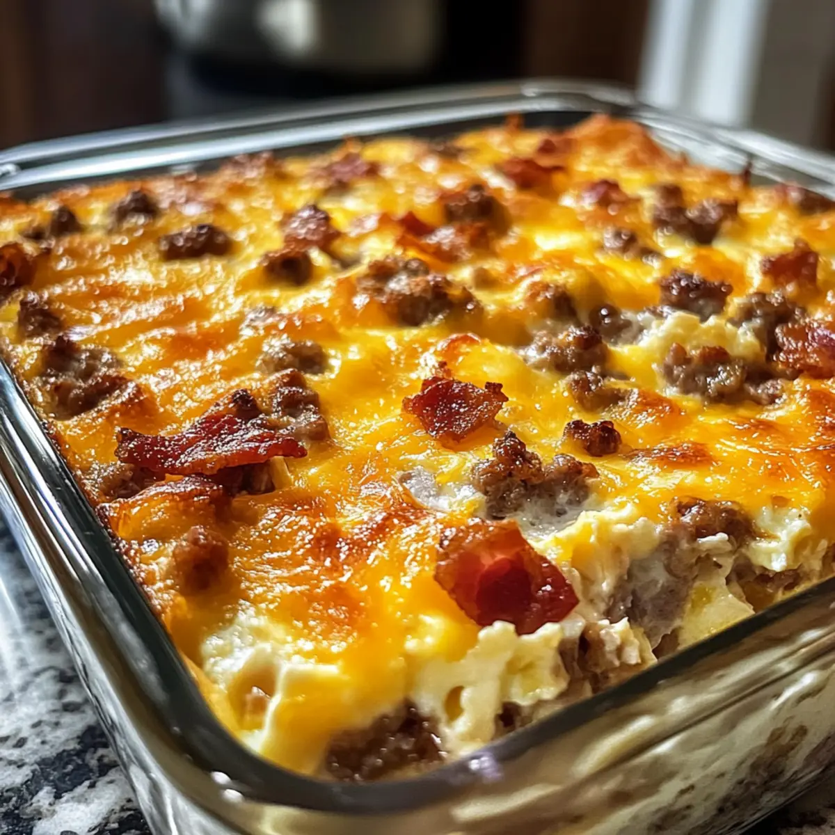 Verteile die gebratene Frühstückswurst und das knusprige Bacon gleichmäßig über die Röstkartoffeln in der Auflaufform. Darauf sprenkle 1,5 Tassen des geriebenen Cheddar-Käses. Gieße dann die vorbereitete Eimischung gleichmäßig darüber. Achte darauf, dass die Mischung überall gut verteilt ist, damit jeder Bissen Geschmack hat.