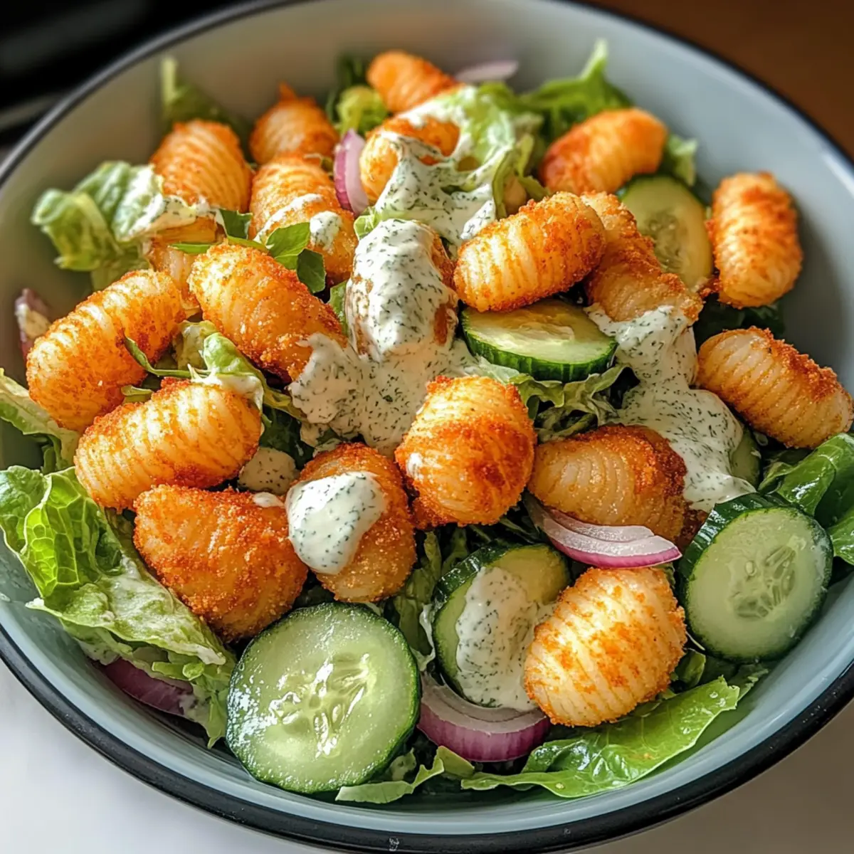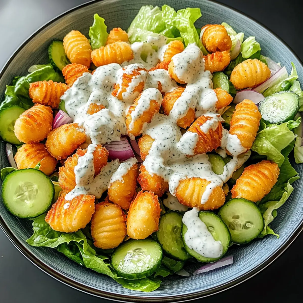 - Serviere den Salat sofort, solange die Gnocchi noch warm und knusprig sind.