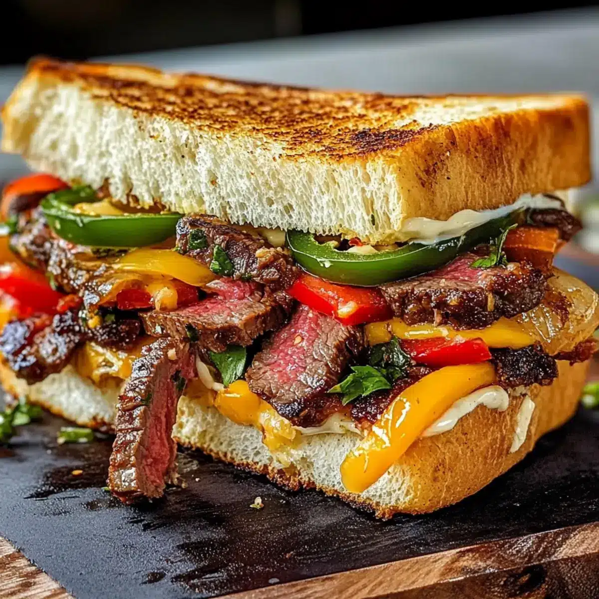 - Dicke Brotscheiben mit geschmolzener Butter bestreichen, und die gebratenen Paprika, Steak und anderen Zutaten darauf schichten.