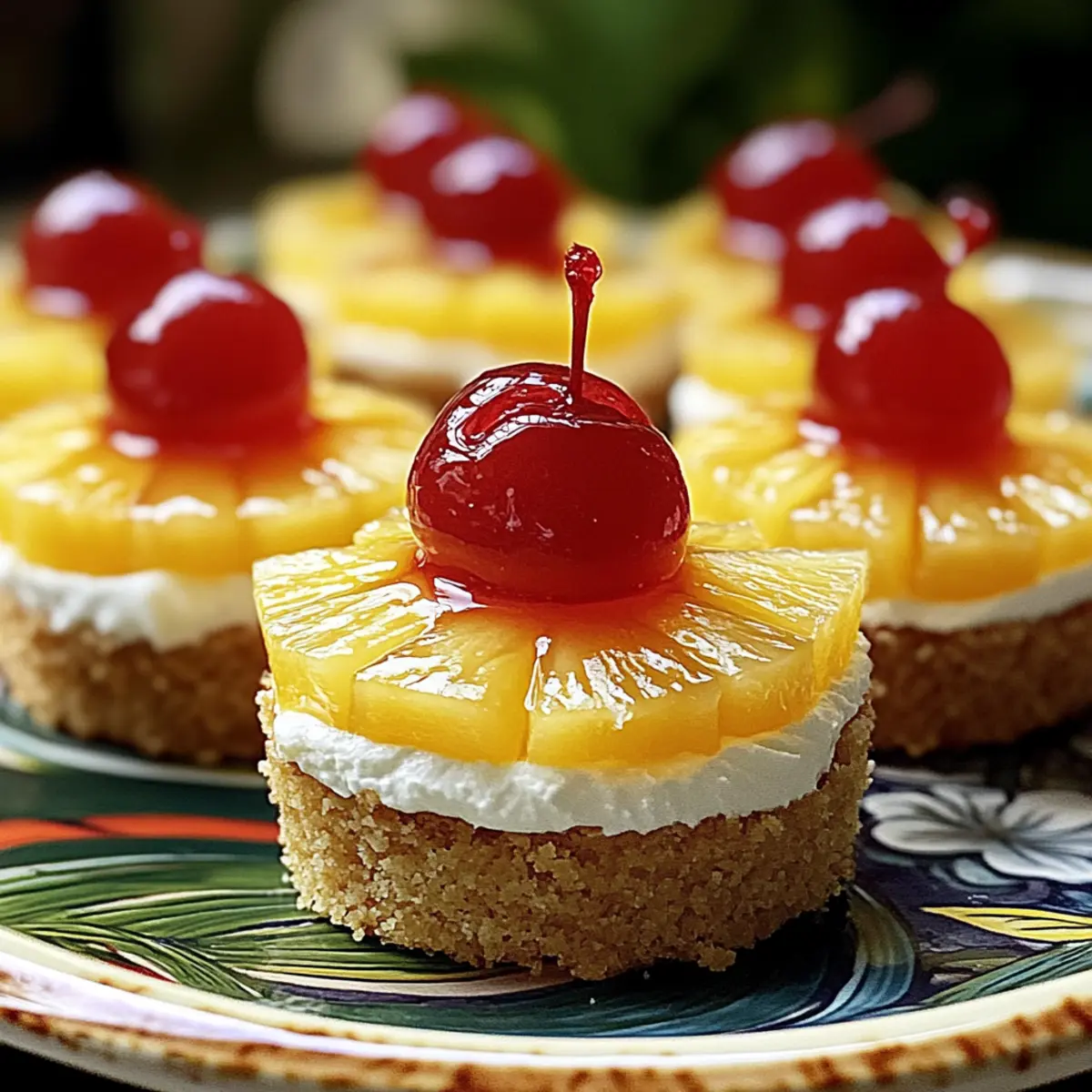 - Mini Ananas-Wendekuchen vorsichtig umdrehen und mit frischen Ananasstücken und Kirschen dekorieren.