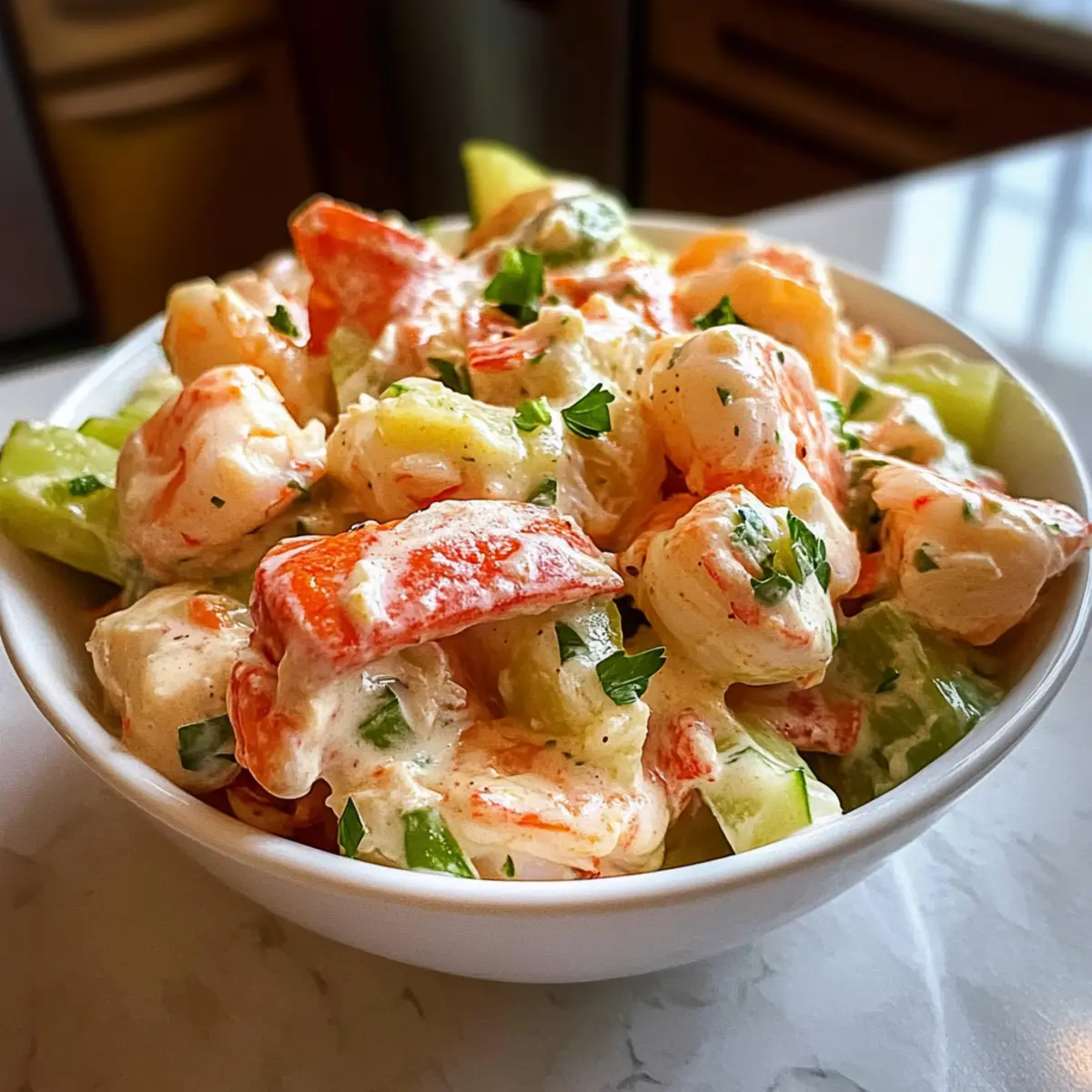 Tiefkühler:: Zum Einfrieren ist dieser Salat nicht geeignet, da die Textur der Meeresfrüchte und das Gemüse nach dem Auftauen leiden.