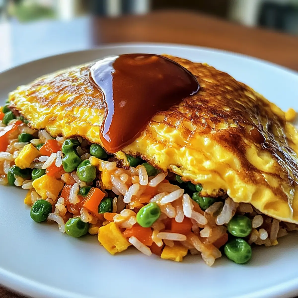 Wenn das Omelett die gewünschte Konsistenz erreicht hat und die Ränder fest sind, lege es vorsichtig über den Reisberg auf dem Teller. Achte darauf, dass das Omelett schön die Form behält. Die obere Mitte kann leicht weich bleiben, was dem Omelettreis ein besonders zartes Gefühl verleiht.