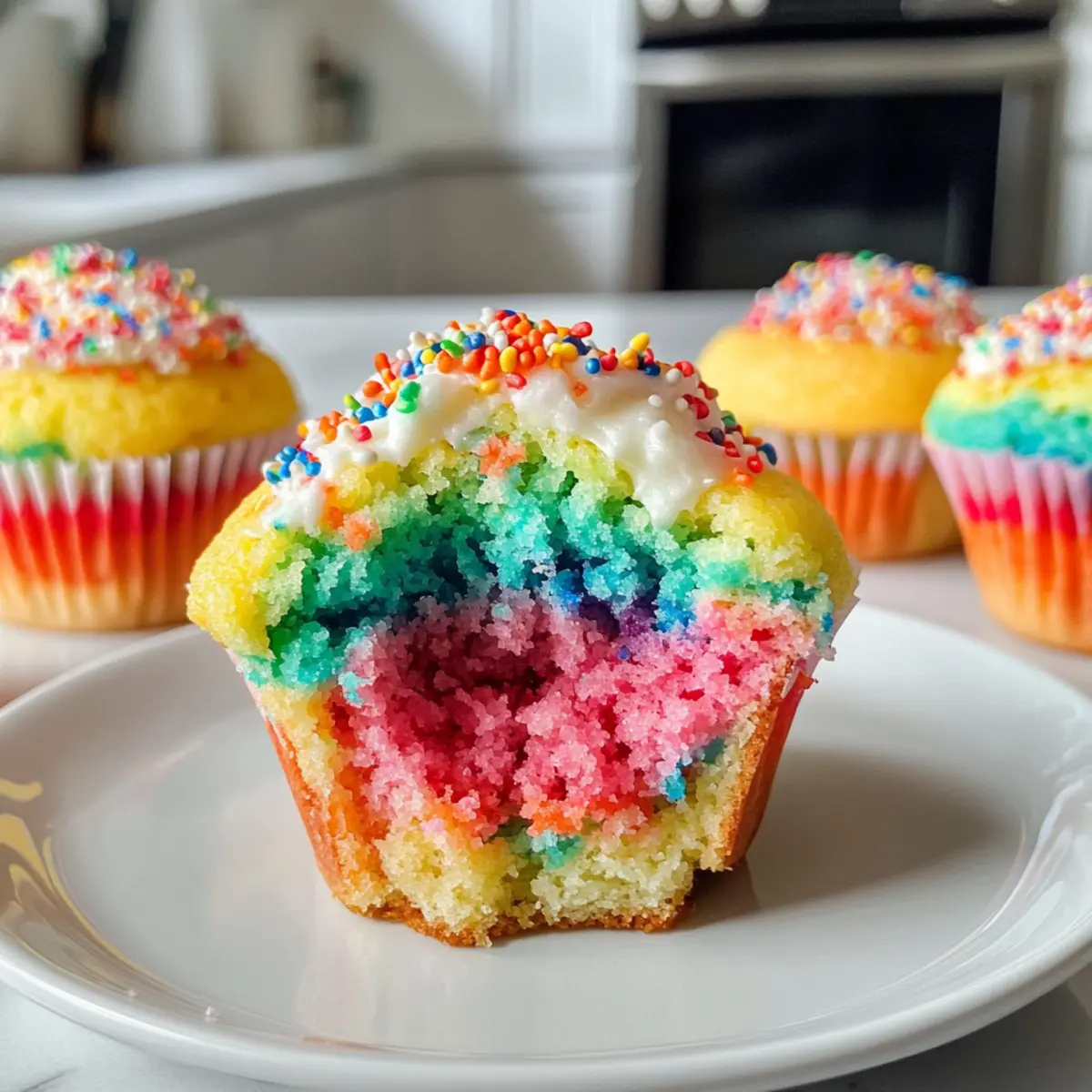 Verteile den bunten Teig gleichmäßig in die vorbereiteten Muffinförmchen. Fülle die Förmchen bis zur Hälfte, um genug Platz für das Aufgehen zu lassen. Wenn du möchtest, kannst du die Muffins mit bunten Streuseln dekorieren, die im Ofen schmelzen und für zusätzlichen Spaß sorgen.