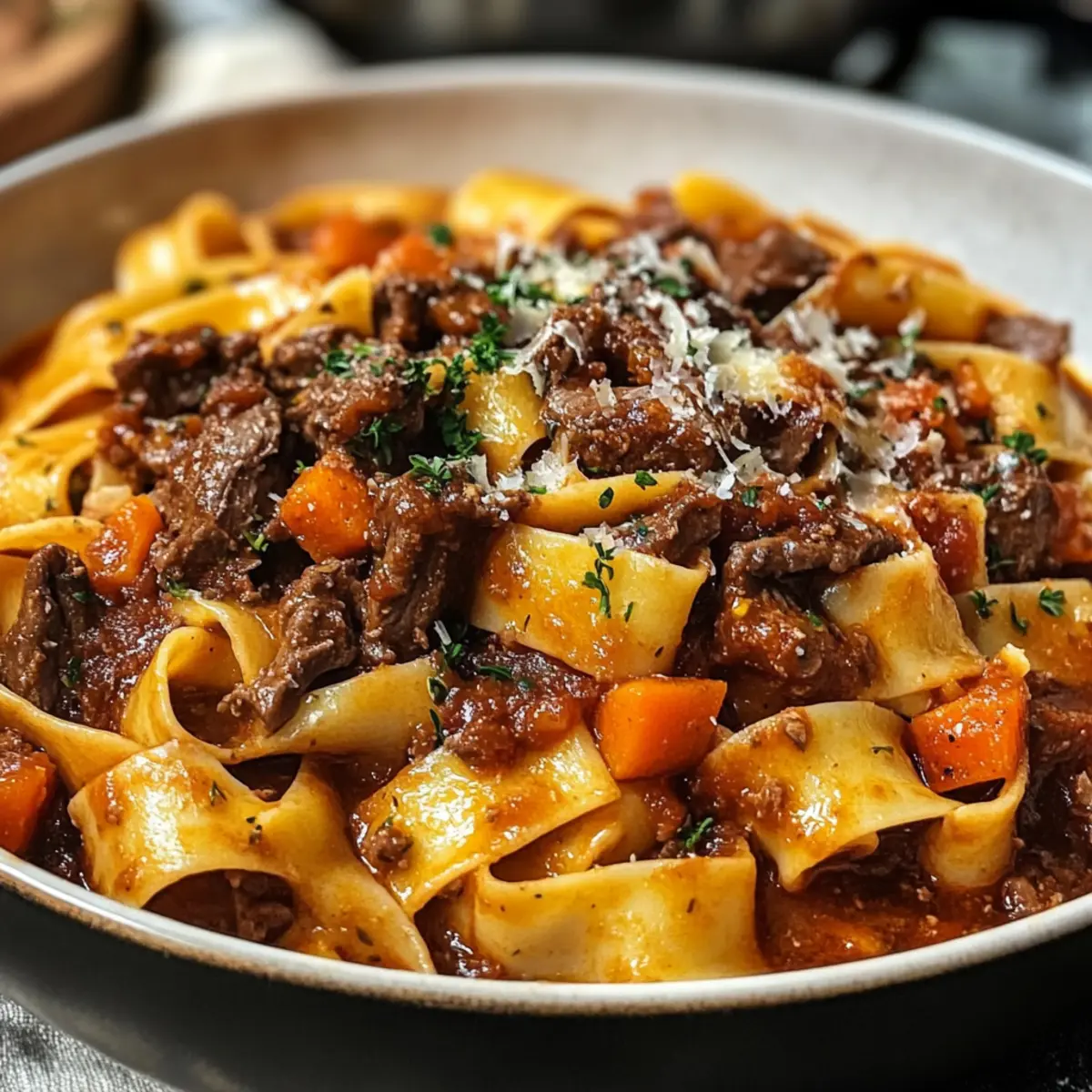 Perfekte Geschmackskombination: Die Kombination aus zartem Rindfleisch, aromatischem Rotwein und breiten Pappardelle sorgt für ein Geschmackserlebnis, das dich umhauen wird.