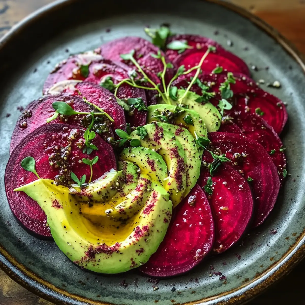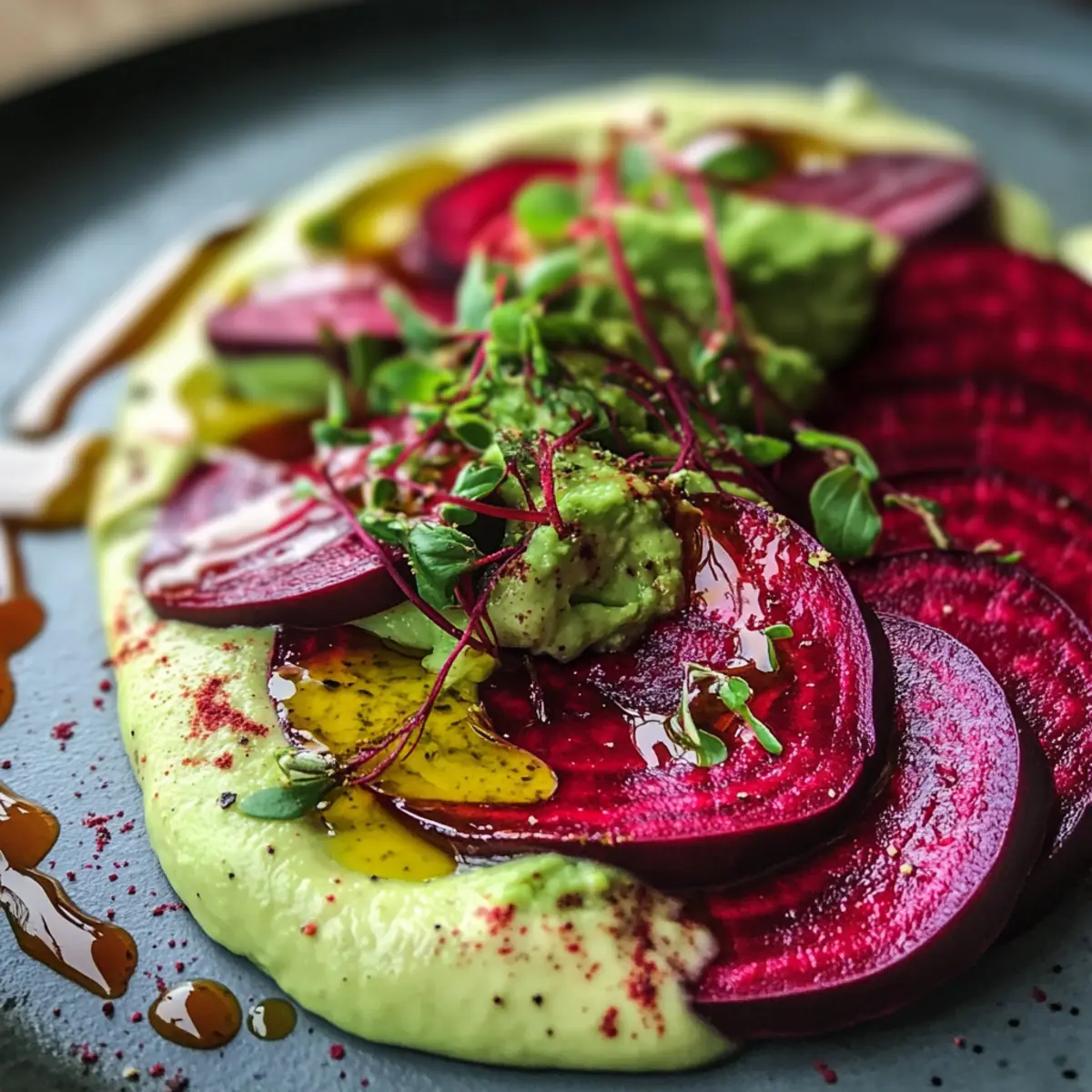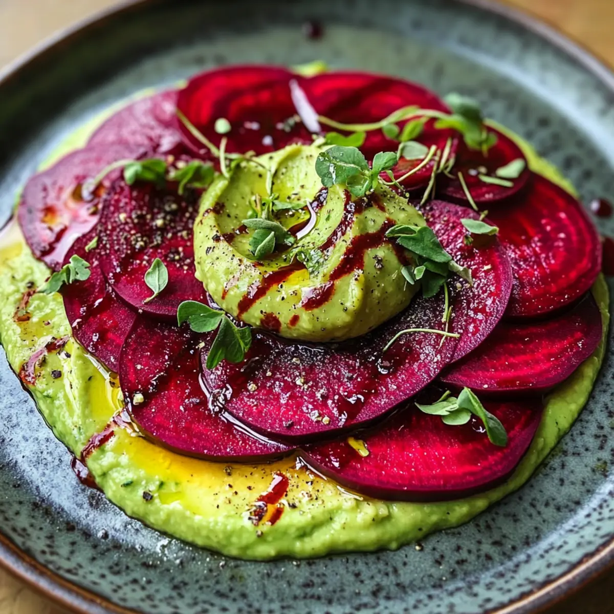 Der erste Biss in das Rote Bete Carpaccio auf Avocadocreme ist wie ein kleiner Ausflug in ein lebendig gefärbtes Gemüseparadies. Frisch gekochte, zarte Scheiben von Roter Bete vereinen sich mit einer cremigen Avocadocreme zu einem Gericht, das nicht nur optisch begeistert, sondern auch Geschmack und Gesundheit auf euren Teller bringt. Diese gesunde, vegetarische Delikatesse ist perfekt für festliche Anlässe oder eine leichte Mahlzeit unter der Woche. Die einfache Zubereitung und die Vielseitigkeit ermöglichen es euch, dieses Carpaccio nach Belieben zu variieren. Für ein zusätzliches Geschmackserlebnis könnt ihr gerne mit frischen Kräutern experimentieren – und welche Farbe wird eurer Kunstwerk auf dem Teller vorschlagen? Lasst uns gemeinsam in die Küche eintauchen!