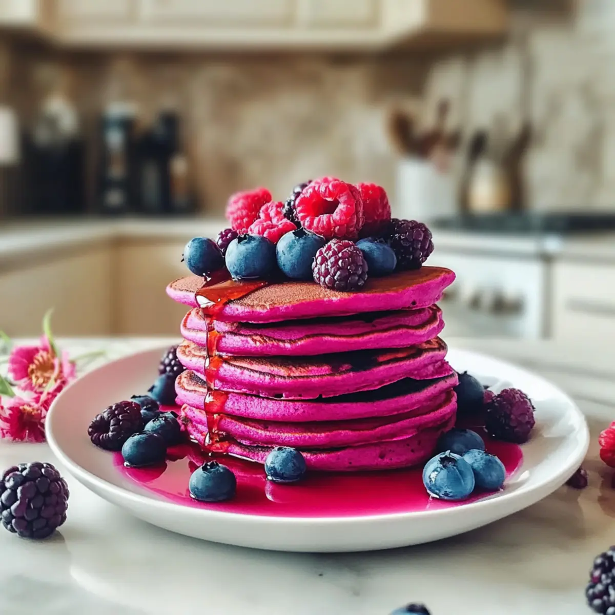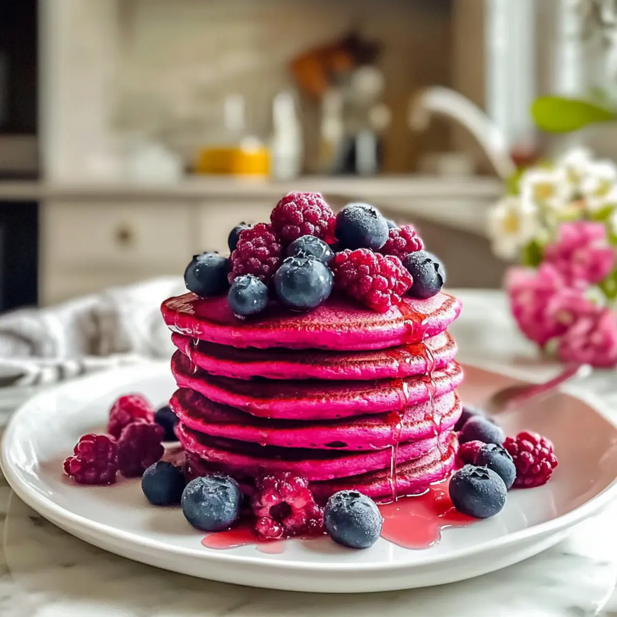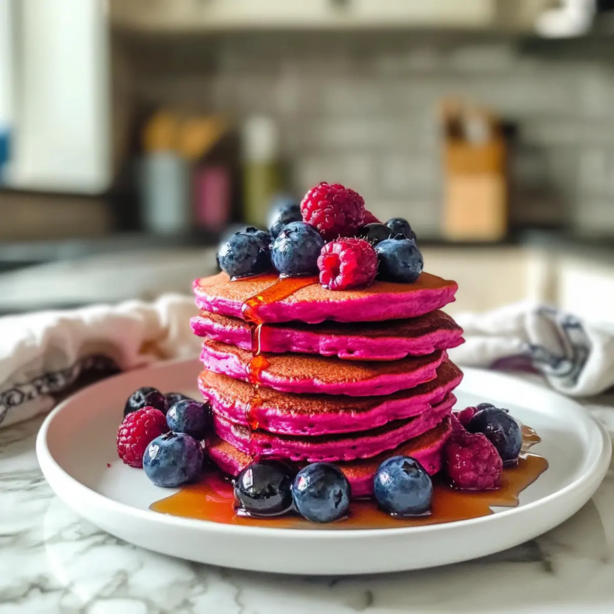 Die Rote Rüben Pfannkuchen warm servieren und nach Belieben mit frischem Obst, einem Klecks Joghurt oder zusätzlichem Ahornsirup garnieren. Genießen Sie diese bunten Köstlichkeiten oder bewahren Sie übrig gebliebene Pfannkuchen in einem luftdichten Behälter im Kühlschrank für 4-5 Tage auf.