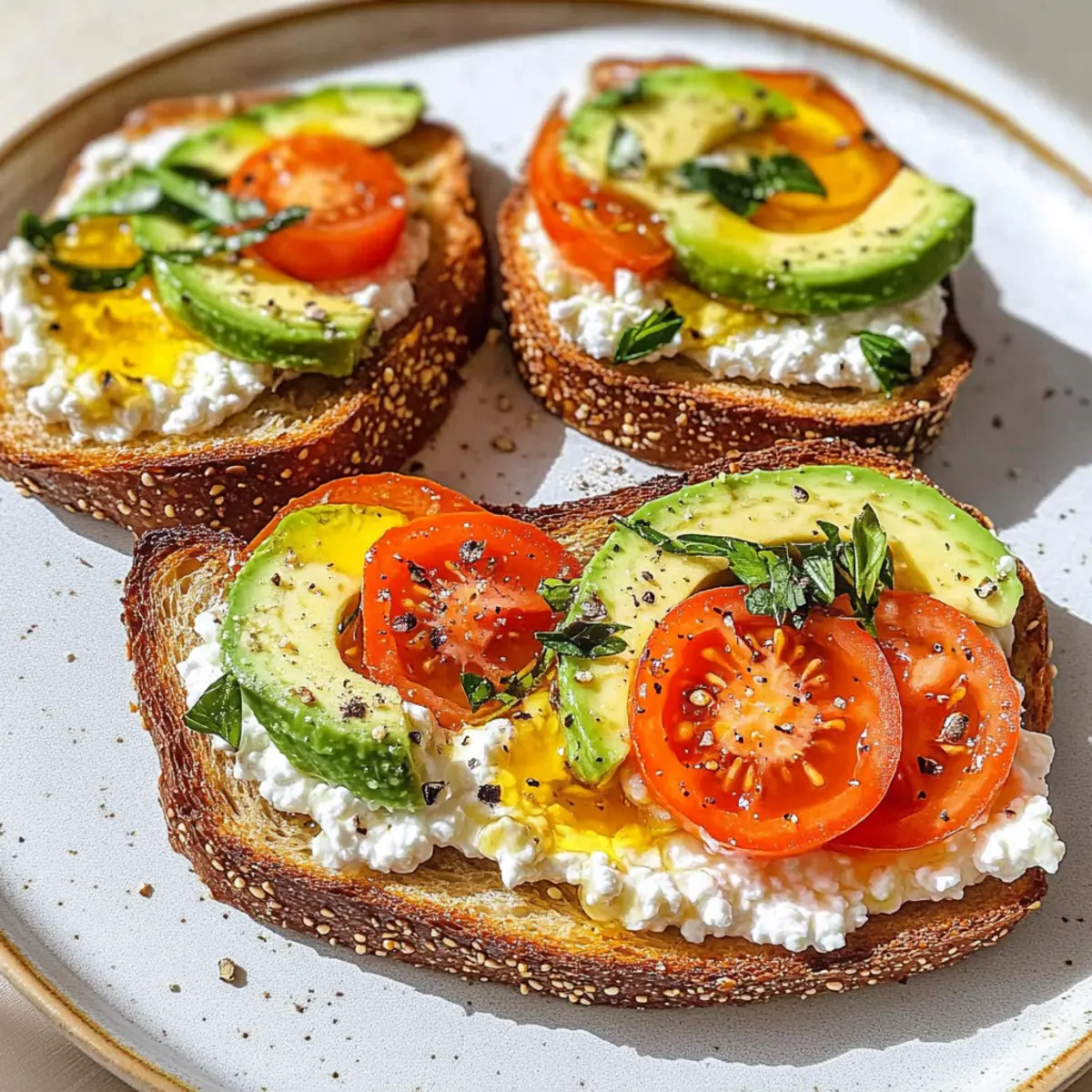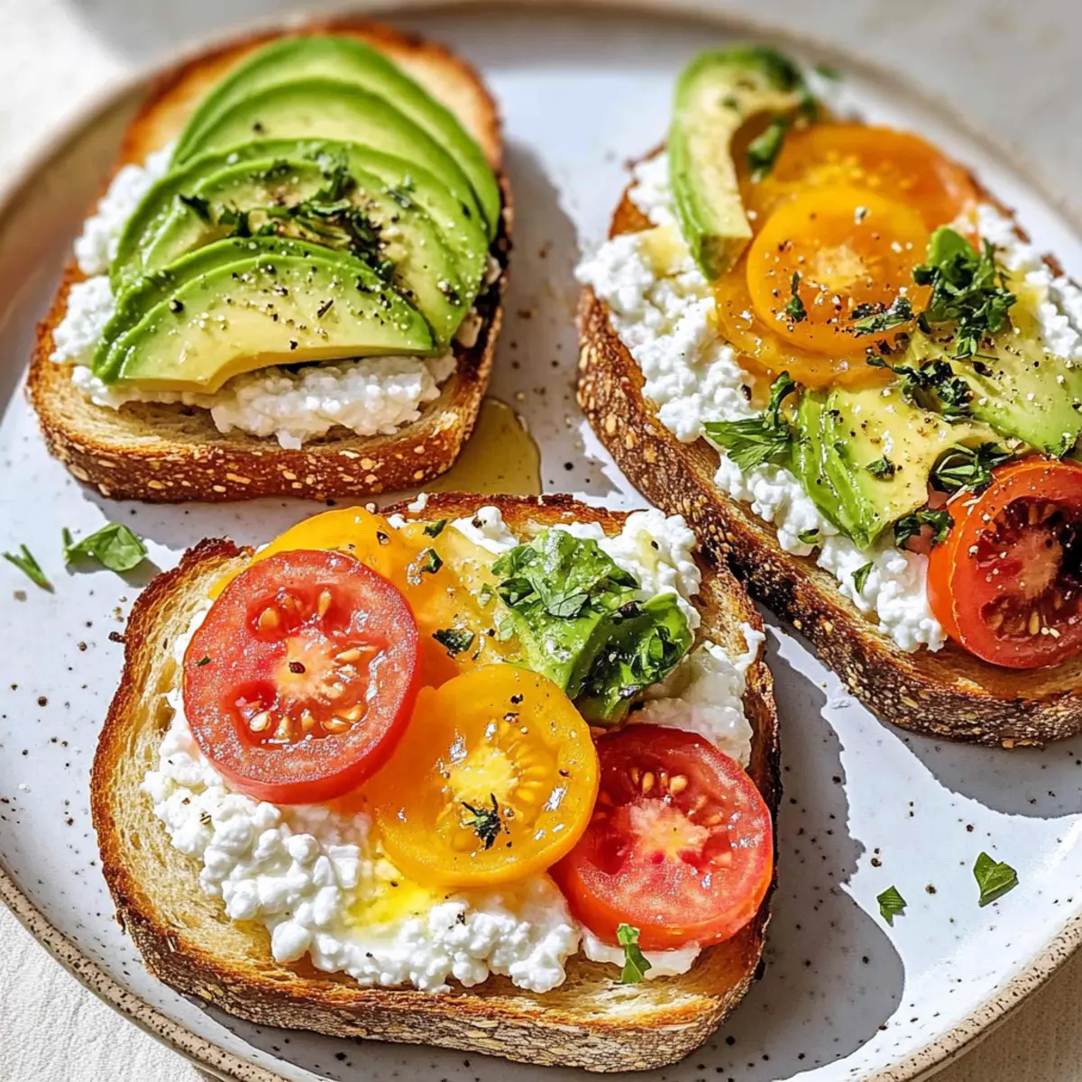 - Verteile den Hüttenkäse auf den gerösteten Brotscheiben und belege sie mit den vorbereiteten Zutaten.