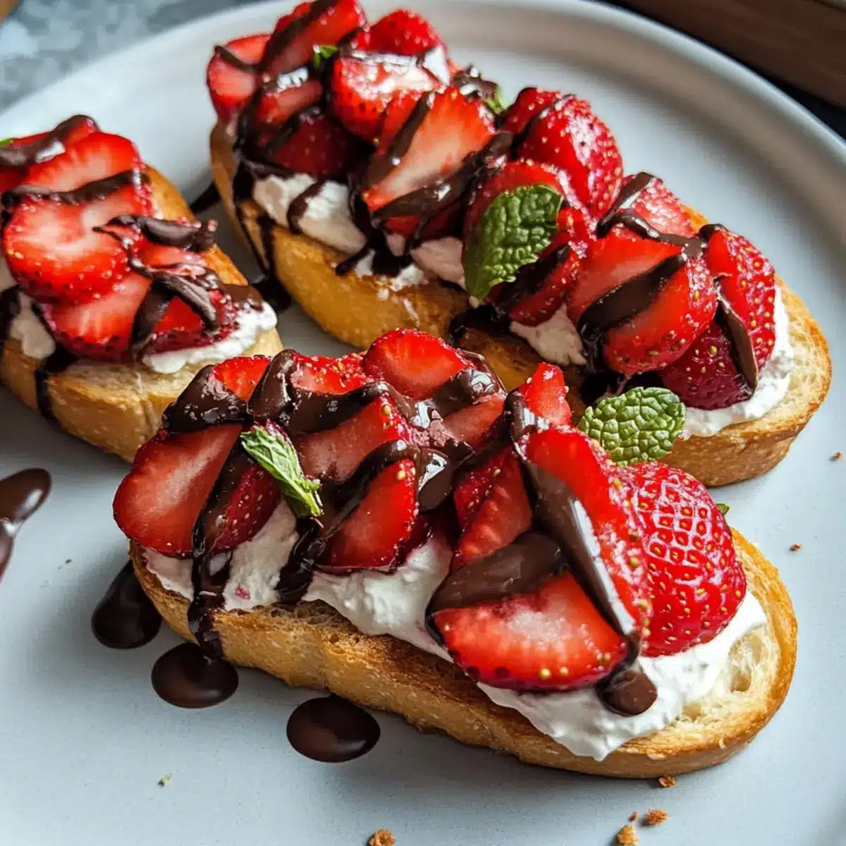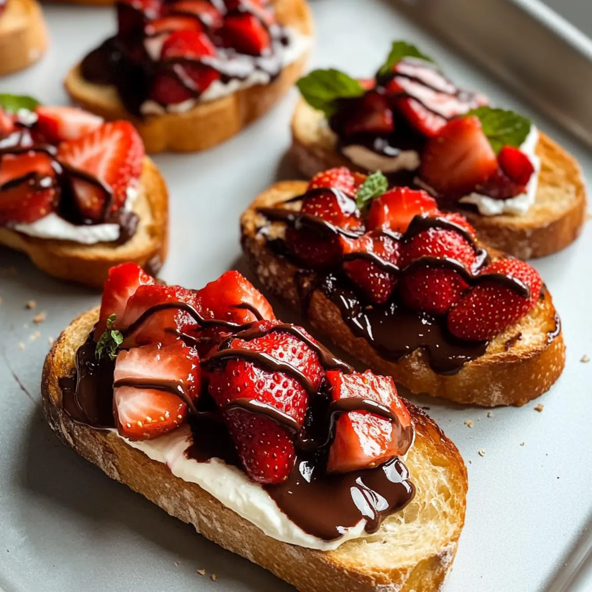 - Bruschetta zusammenstellen: Erdbeeren auf Baguettescheiben verteilen, geschmolzene Schokolade darüber träufeln und nach Belieben garnieren.