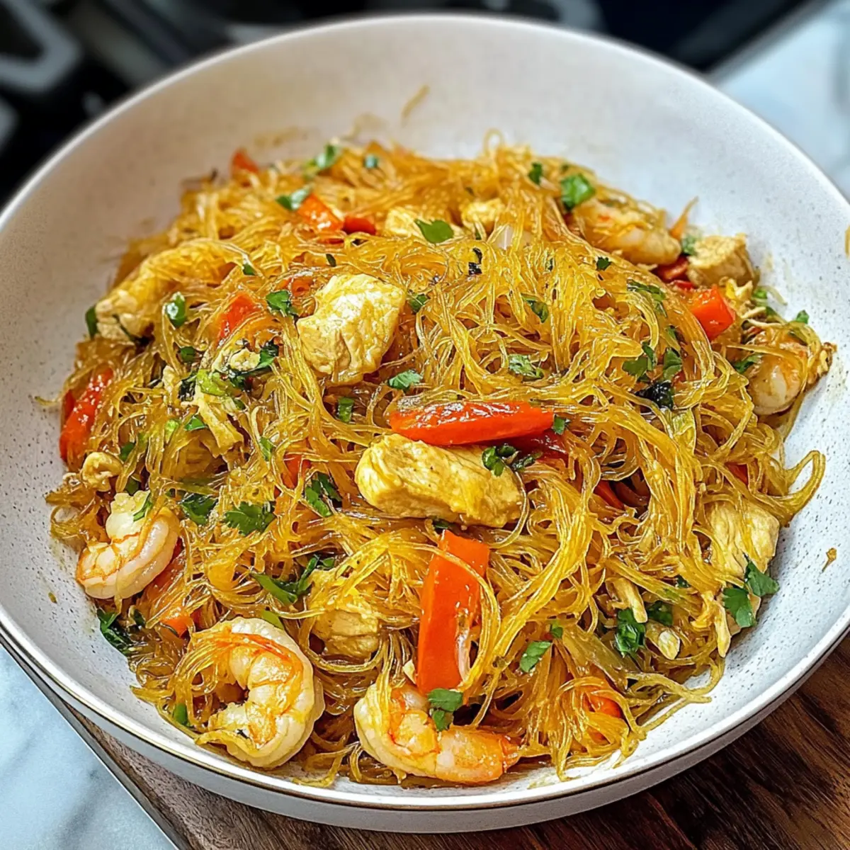 In einer kleinen, dampfenden Küche fühle ich mich wie ein Meisterkoch, wenn ich die leuchtend bunten Zutaten für meine Singapur-Nudeln zusammenstelle. Diese köstliche Mischung aus zarten Reisvermicelli, saftigem Hähnchen, frischen Garnelen und knackigem Gemüse ist nicht nur ein Fest für den Gaumen, sondern auch ein wahrer Wochentagsheld: In nur 35 Minuten zauberst du ein schnelles und geschmackvolles Abendessen, das die ganze Familie lieben wird. Du kannst die Rezeptur ganz nach deinem Geschmack abwandeln, zum Beispiel mit einer vegetarischen Variante — so bleibt kein Wunsch offen! Bereit, in die Welt der aromatischen Aromen einzutauchen? Lass uns gemeinsam die perfekte Schüssel Singapur-Nudeln kreieren!