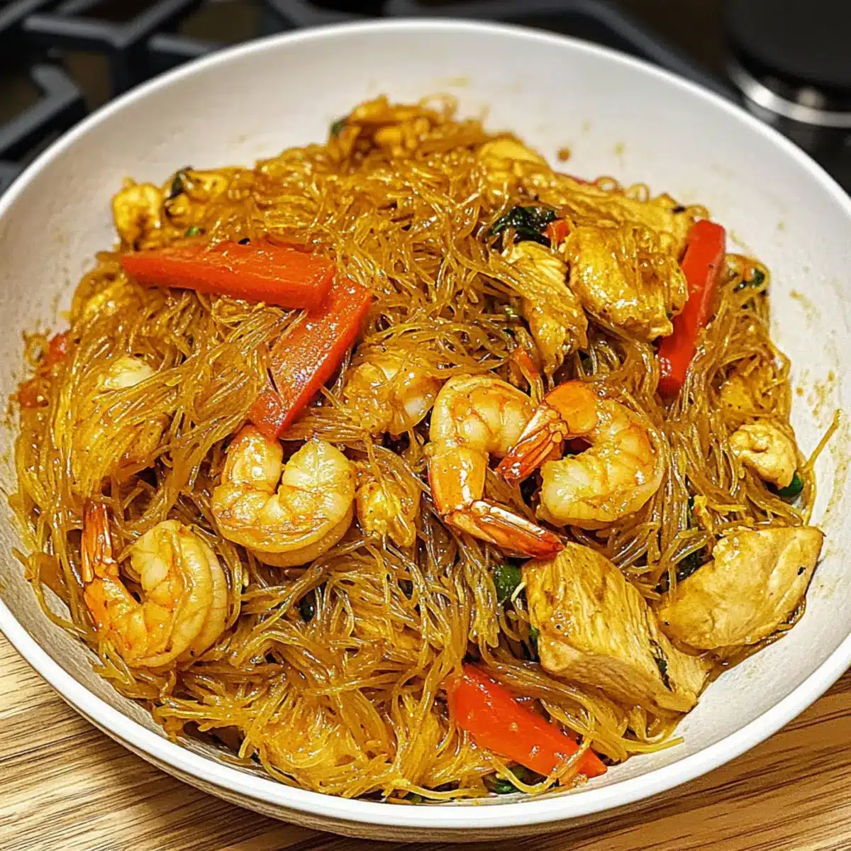 - Reisvermicelli, Hähnchen und Garnelen hinzufügen, Currypulver darüber streuen.