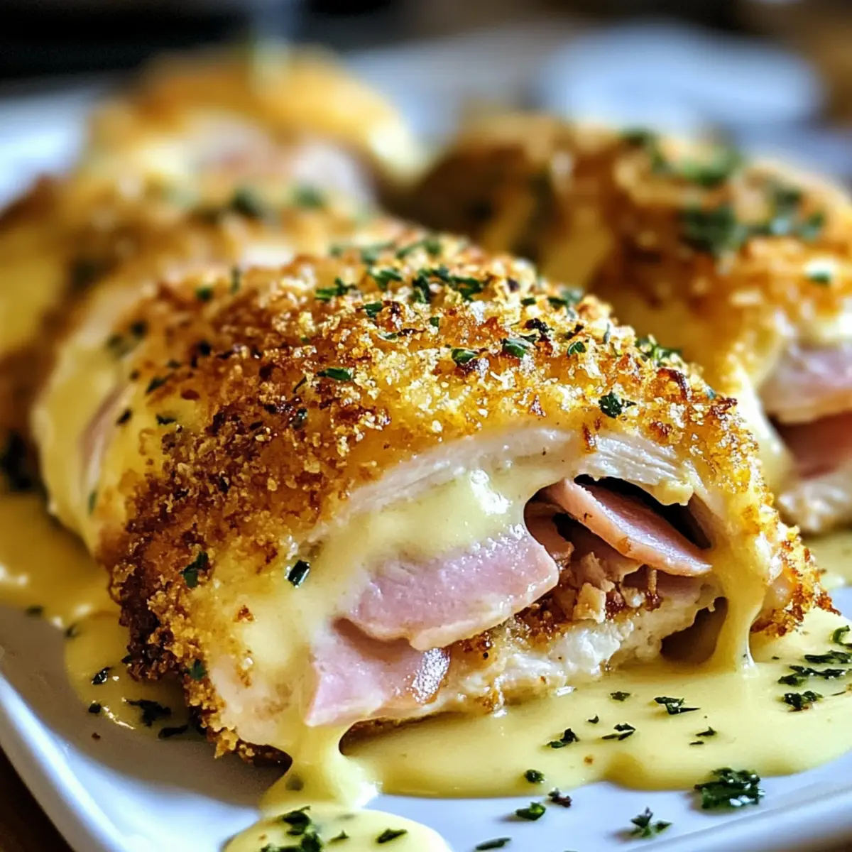Frische Kräuter verwenden: Ergänze dein Gericht mit frischen Kräutern als Garnitur. Sie verleihen nicht nur einen optischen Reiz, sondern auch einen geschmacklichen Frischekick, der das Überbackenes Hähnchen Cordon Bleu abrundet.