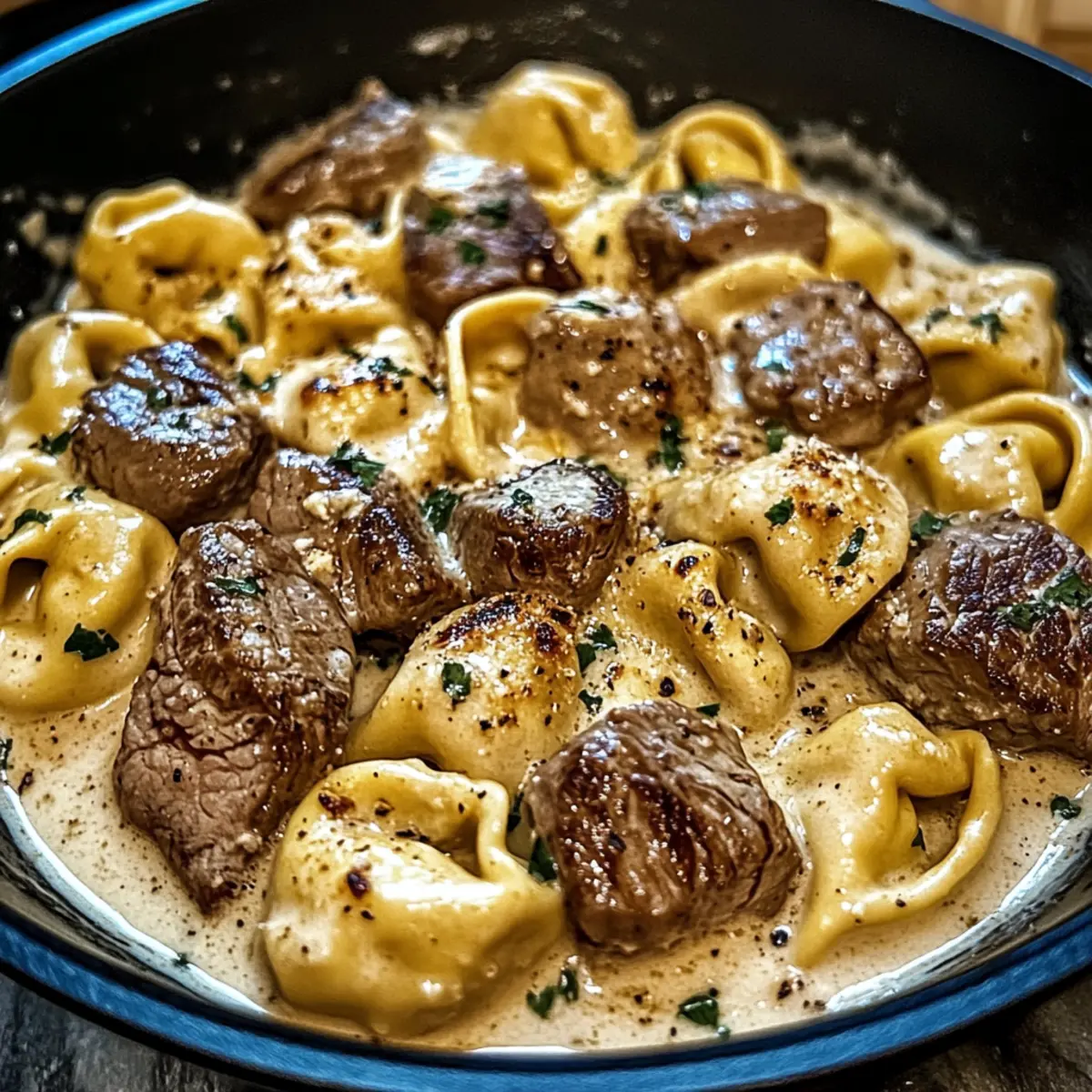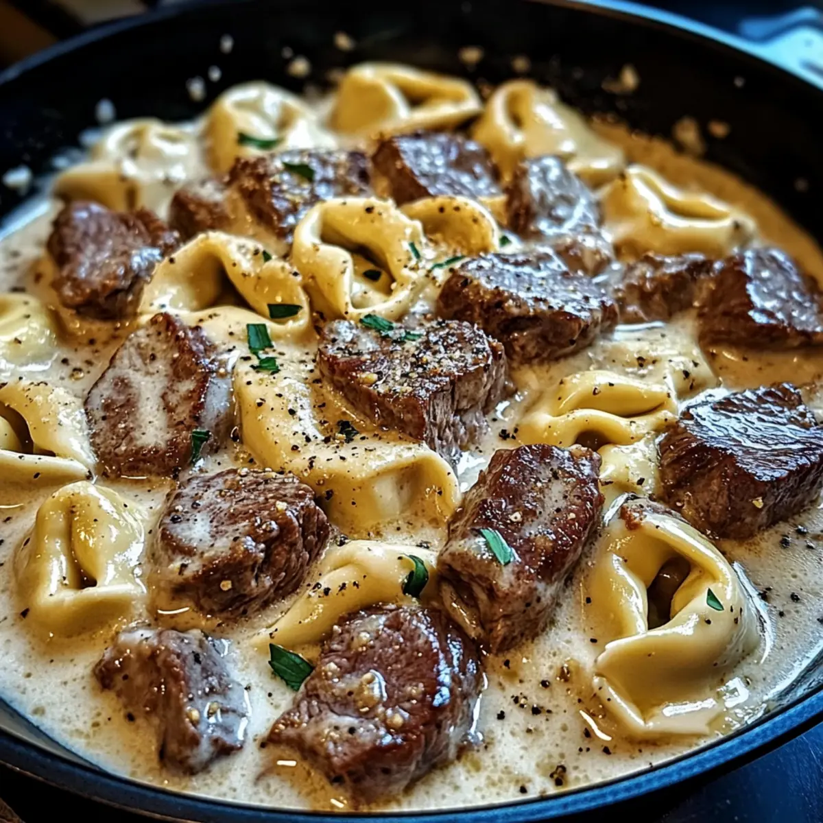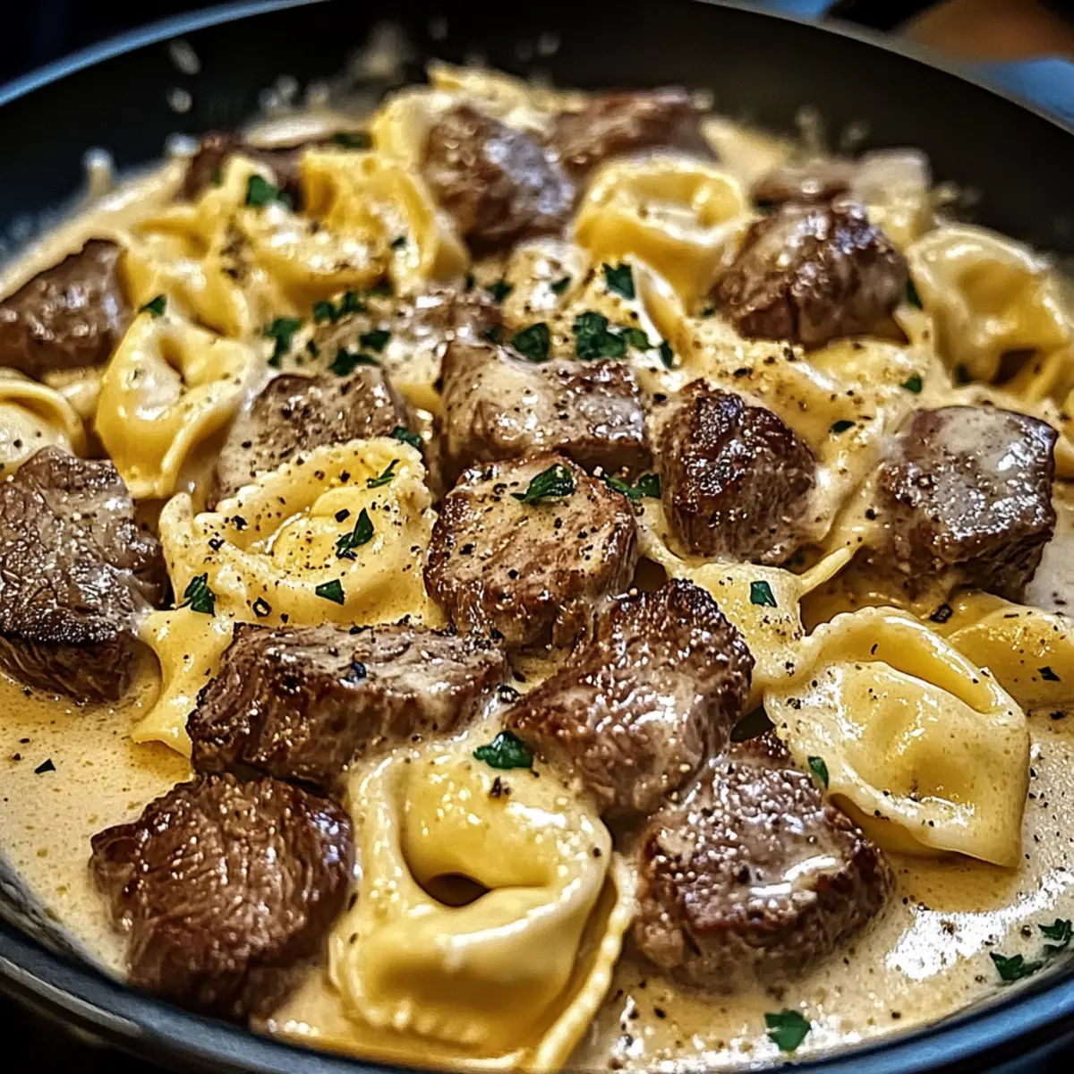 - Gib das in Streifen geschnittene Steak und die zuvor gekochten Tortellini in die Soße. Tossiere alles vorsichtig für 2 Minuten.