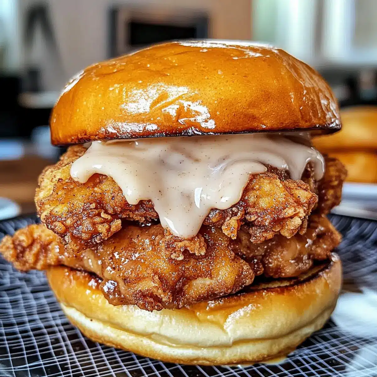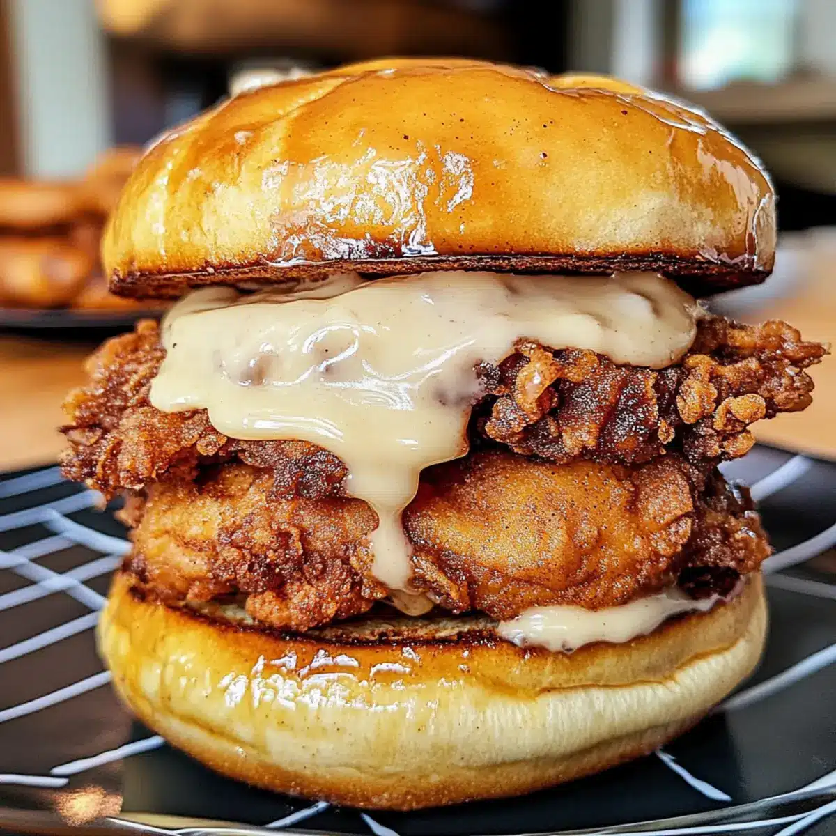 Sobald die Zimtschnecken fertig sind, schneide sie horizontal auf und füge das frisch frittierte Hühnchen hineein. Träufle die Glasur aus Puderzucker und Milch großzügig über das Hühnchen. Serviere das Sandwich warm und genieße die Kombination von süß und herzhaft im Zimtschnecken frittierter Hühnchen Sandwich.